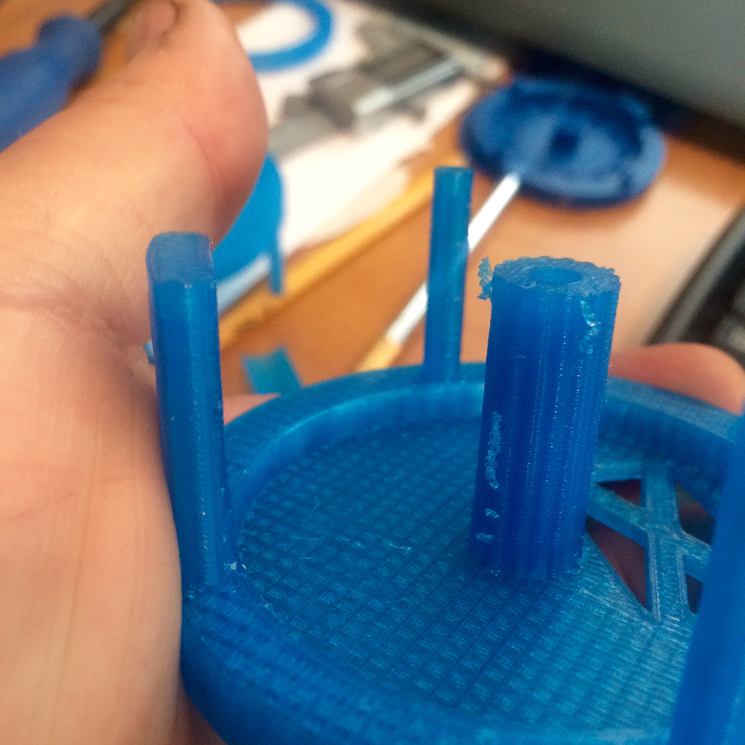 I've already trimmed them off the smaller posts where they were much worse. Some were also snapped off the center post. I have been able to eliminate these in KISS and KISS also has an interesting feature where it starts the perimeter from the inside at a 45° angle and ends it the same way. This probably has a lot to do with how clean the perimeters are on KISS gcode. I have not started to attack this problem yet in S3D but it is next on the list. Any suggestions?