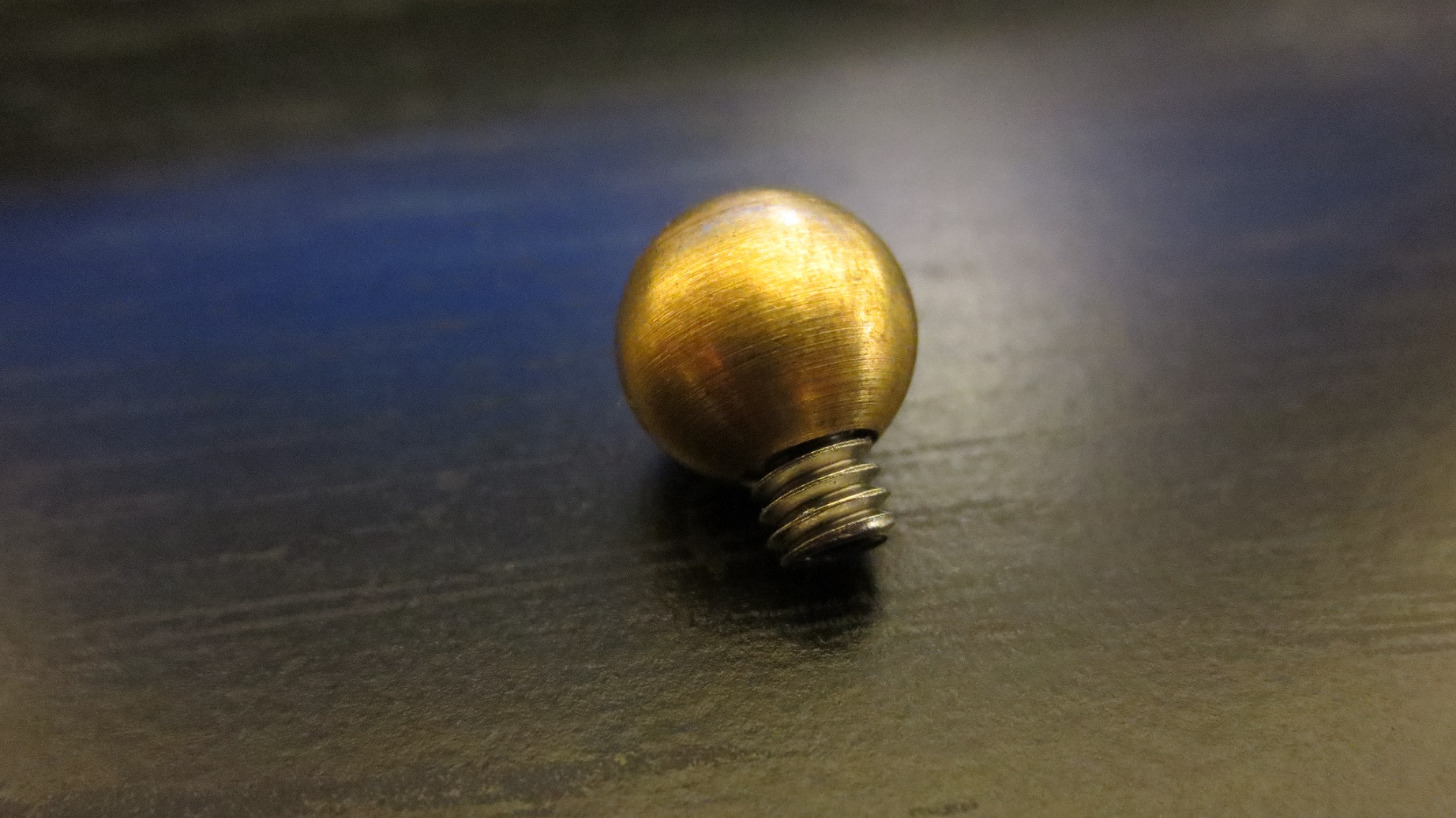 These are the balls I'm considering. They're 0.375 diameter with 8-32 tapped holes. They come in plain brass and nickel plated brass, shown next to a 3/8 chrome steel ball bearing for comparison.