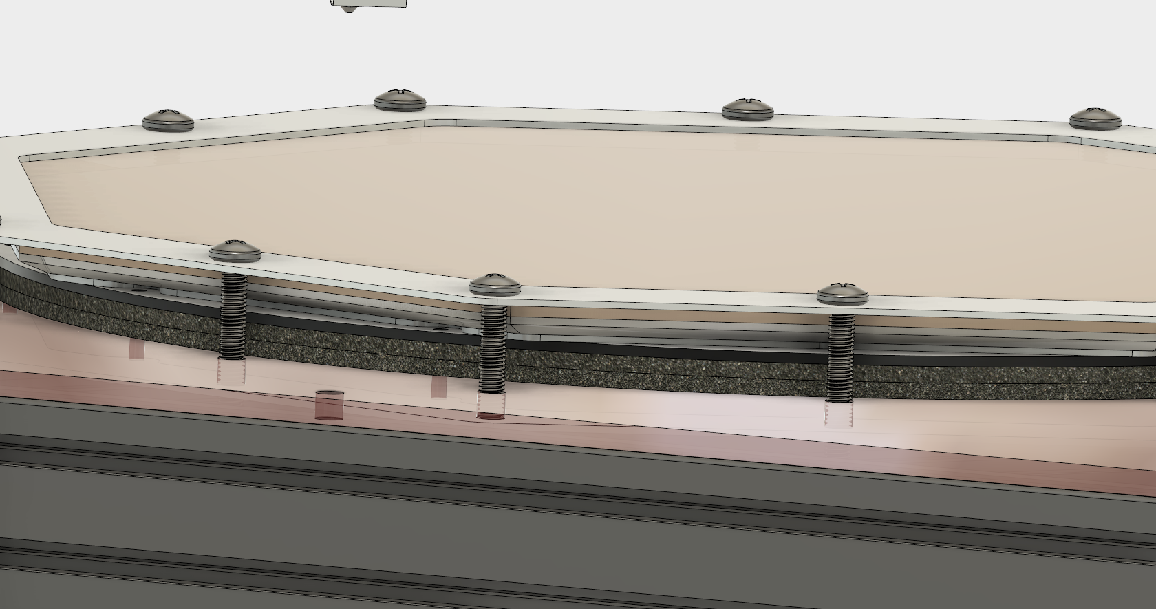 From the top down: Aluminum retaining ring, PEI, Octagonal mirror ($10 at michaels), aluminum heat spreader, Onyx Heat bed, two pieces of cork, and an acrylic (red) base. Second retaining ring underneath that also mounts to the onyx bed. Does that seem like a good heat bed sandwich? Where would you put the thermistor?