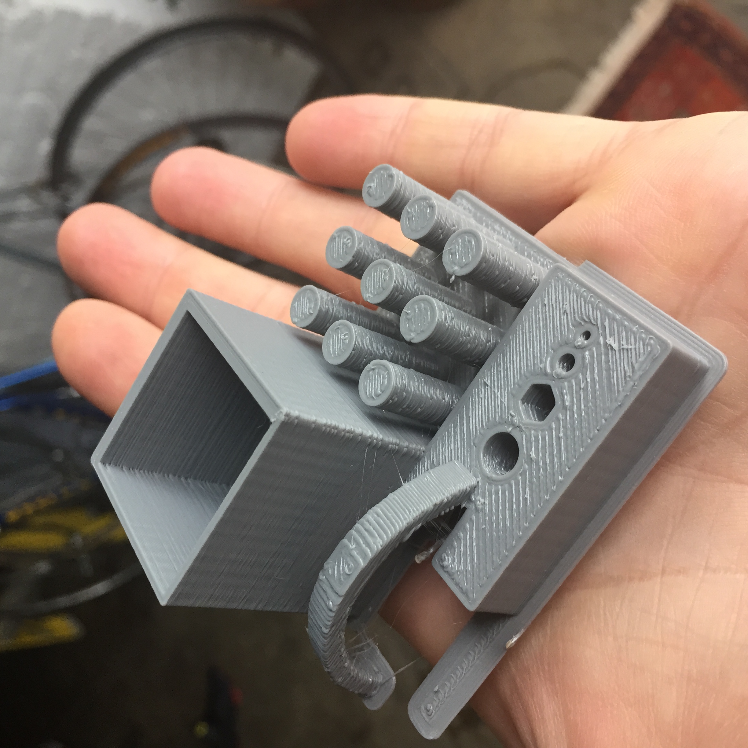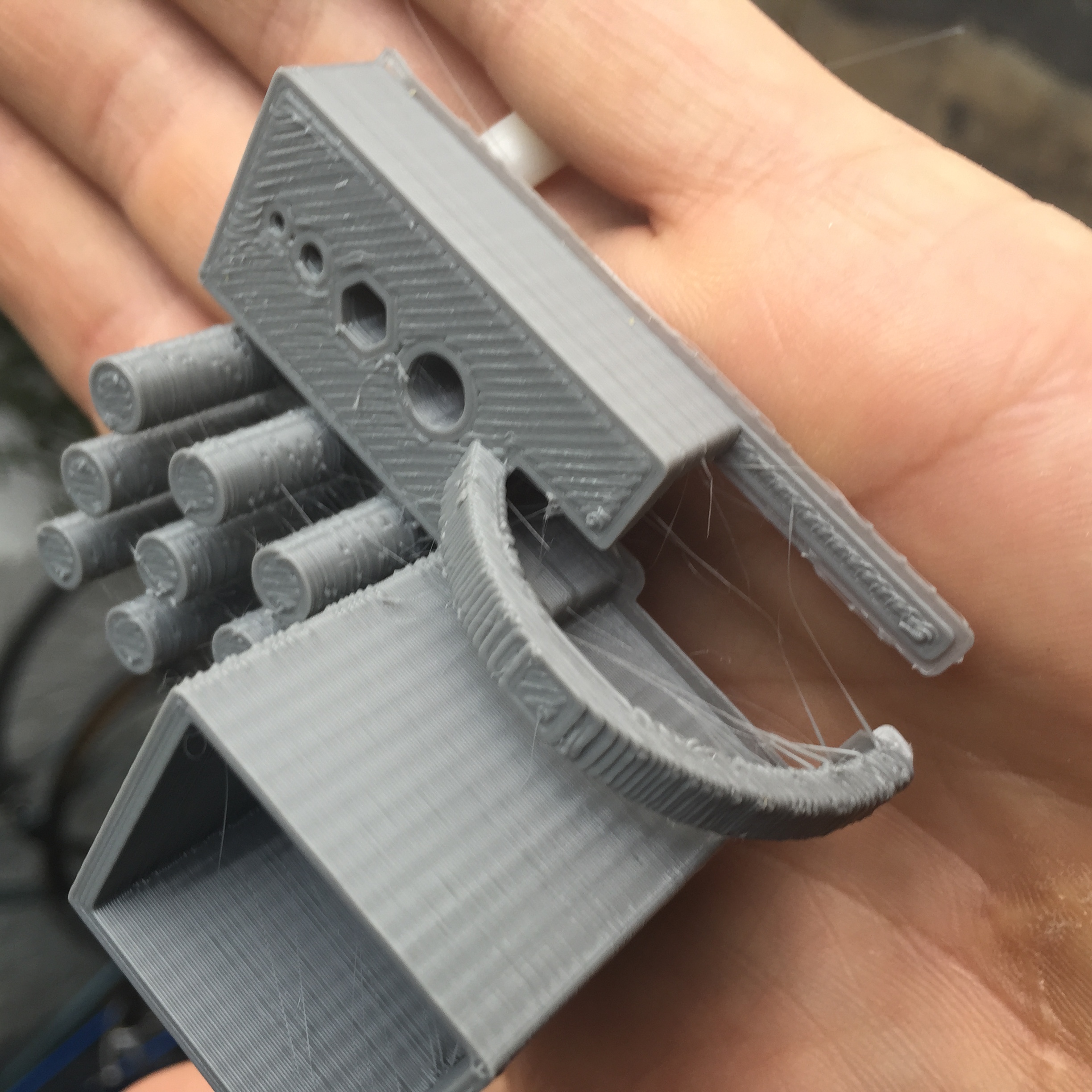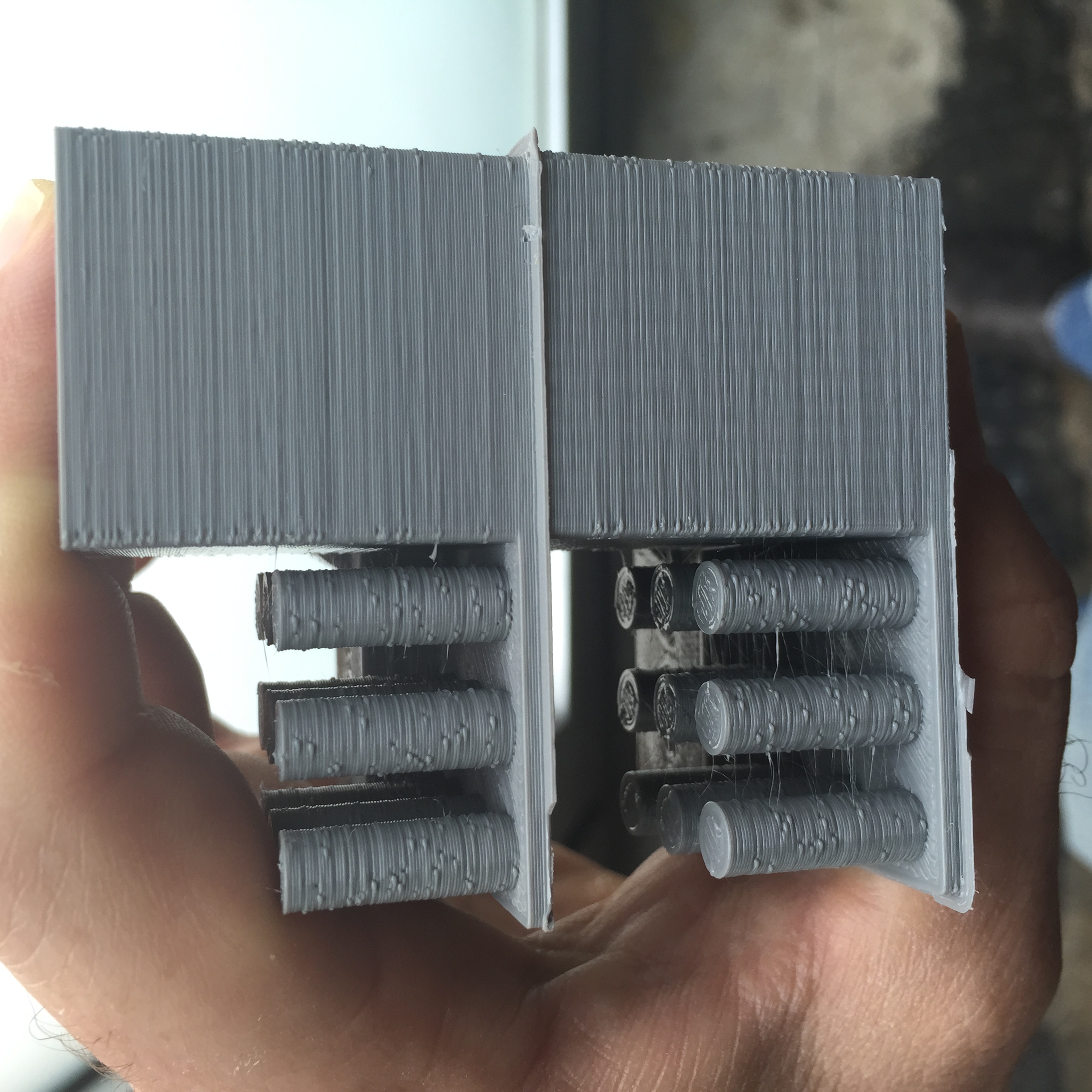 I've beed doing some 'torture tests' with PLA in the interest of improving print quality after installing trick laser arms and an e3dv6. I'd like to minimize the blobbing or warts, the stringing, and the inconsistent layer lines seen in the photo below lit chiaroscuro to exaggerate imperfections: