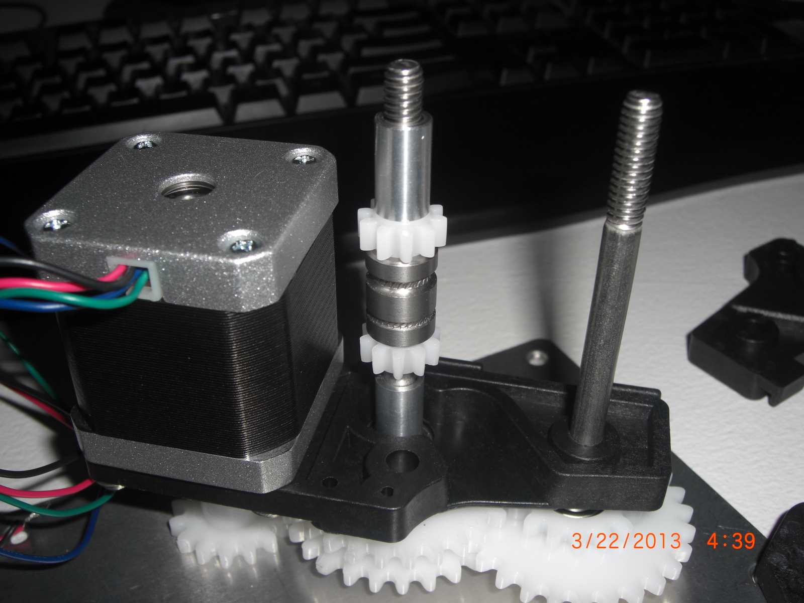 extruder done, wont be long now..My gears for the extruder were warped causing some binding. I had to do some sanding in order for it to spin freely. Very unusual. Seemed like the quality of those gears were lacking a bit but I got it to work. I didn't put a flat on the stepper motor shaft this time. Seemed like the press fit gear had plenty of bite to stay on the shaft.