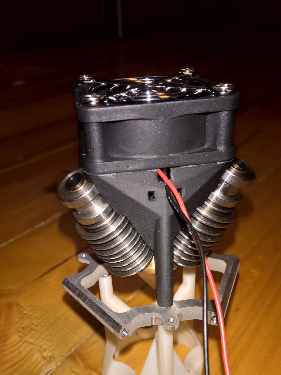 Could you please give dimensions you have got in result? Most important, what position of effector ralative at nozzle orifice? I am designing holder from scratch, and only thing to be done is to set effector position. Also, could you please explain why "The height of the support legs for the mount is somewhat critical"? What positions are mechanically save to work with?Polygonhell wrote:I finally got a couple of completed prints out of mine. The height of the support legs for the mount is somewhat critical, I ended up modifying the open SCAD file printing a second one, then adding spacers.