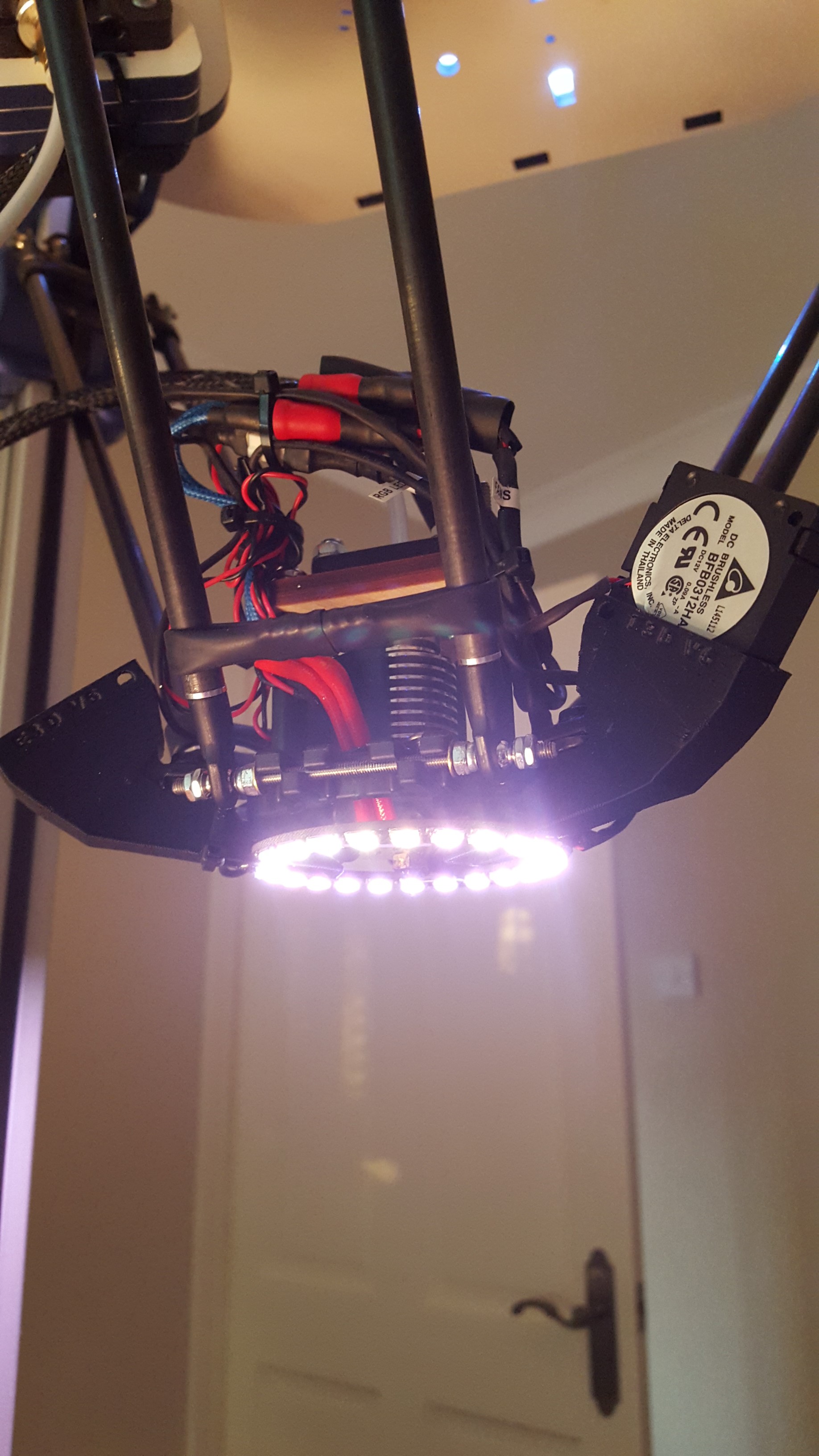 Printed 3x layer fan holders. First I redesigned a model I found online to hold my 24 LED RGB ring and then fitted them. Got one fan installed and at 100% it doesn't seem to affect the nozzle temp at all.