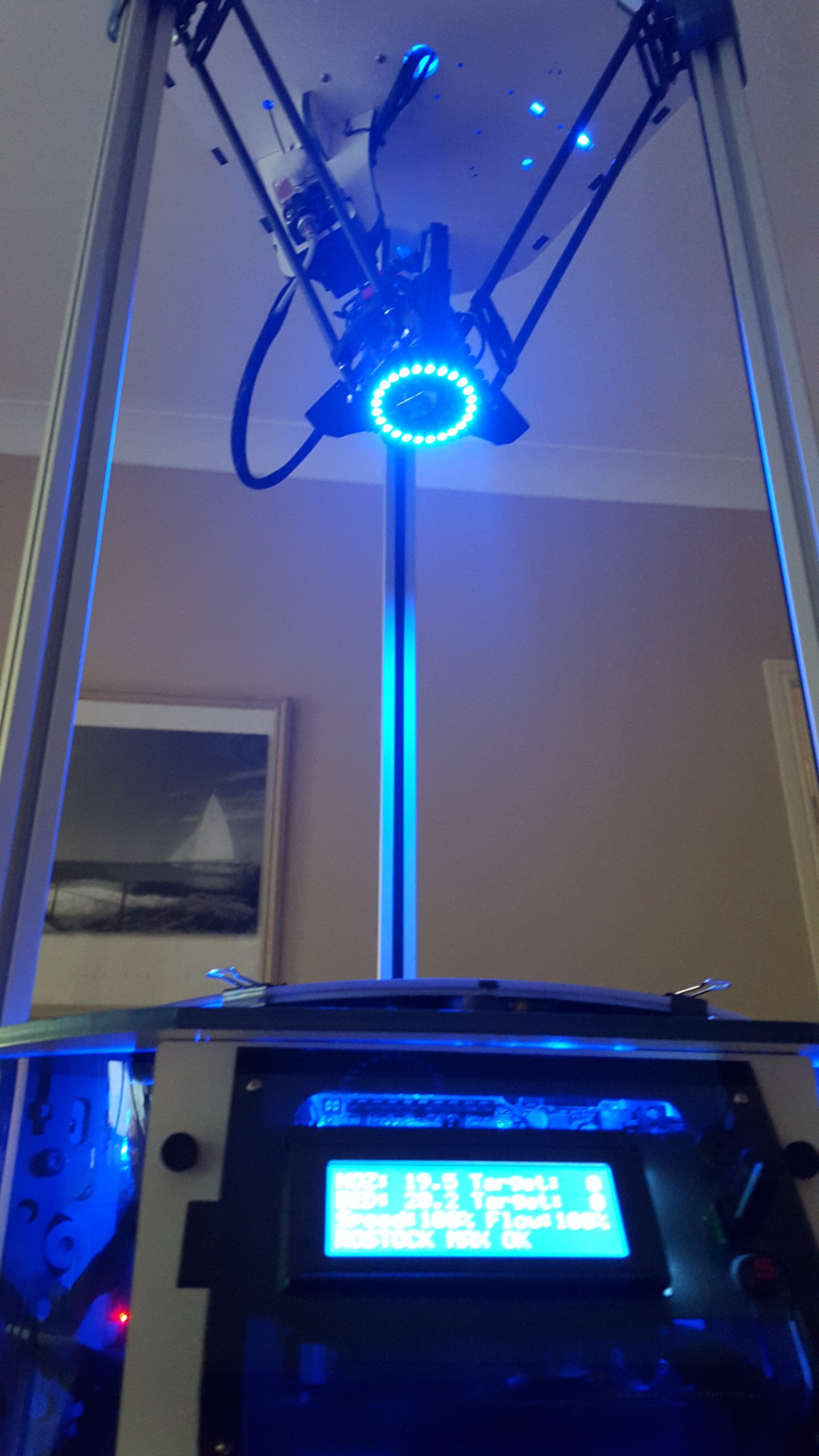 Also a custom Arduino driven Adafruit 24 RGB Led ring mounted under the hot end. This monitors the chassis RGB leds and copies their colour. I usually have it set to white to help with monitoring the print.
