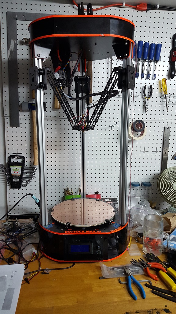 Here is what my version of the finished Rostock MAX V2 looks like. I've since moved the Rostock from the garage to my home office.