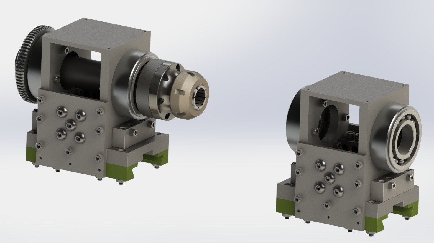 OK so a few design changes that I need to bring up here. I know I haven't shown the full machine yet, but I will soon enough. For now, I need your advice on the headstock and spindle designs. For the next few months I will have access to a full sized CNC lathe, so I can do full sized parts with THREADS and stuff!