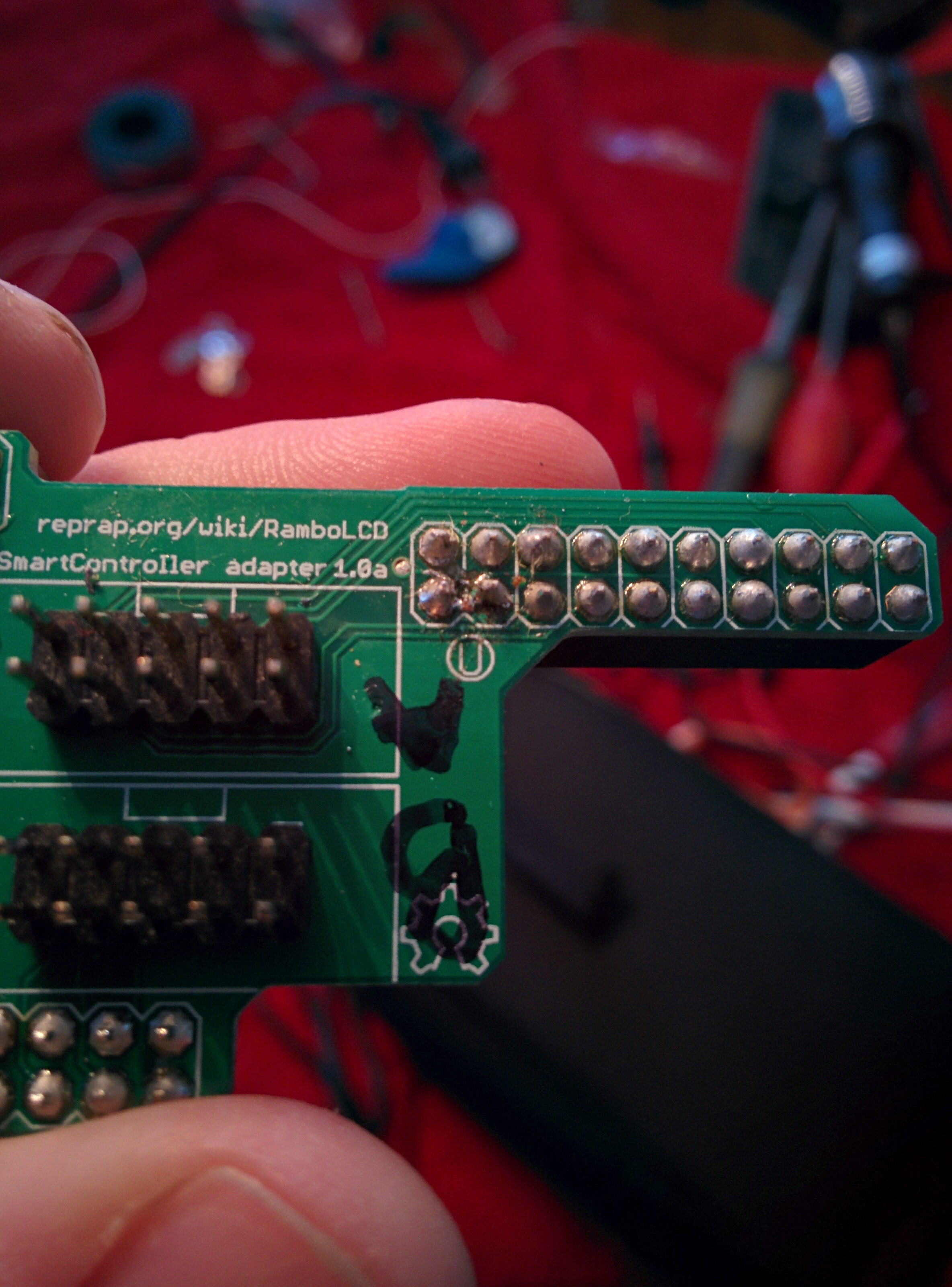 It is possible to plug the cables from the LCD into the Rambo backwards. Be sure the red wires are on the right as you look at them plugged into the adapter and the back of the LCD, please check them and get back to us.M-I-H1 wrote:I am having the same problem, finished assembly of my Rostock MAX V2 last evening, on power up I do get 2 flashes from the Status LED (yellow) and a solid green LED on the RAMBo, but nothing on the LCD. All fans are running and have 12.2V coming in.