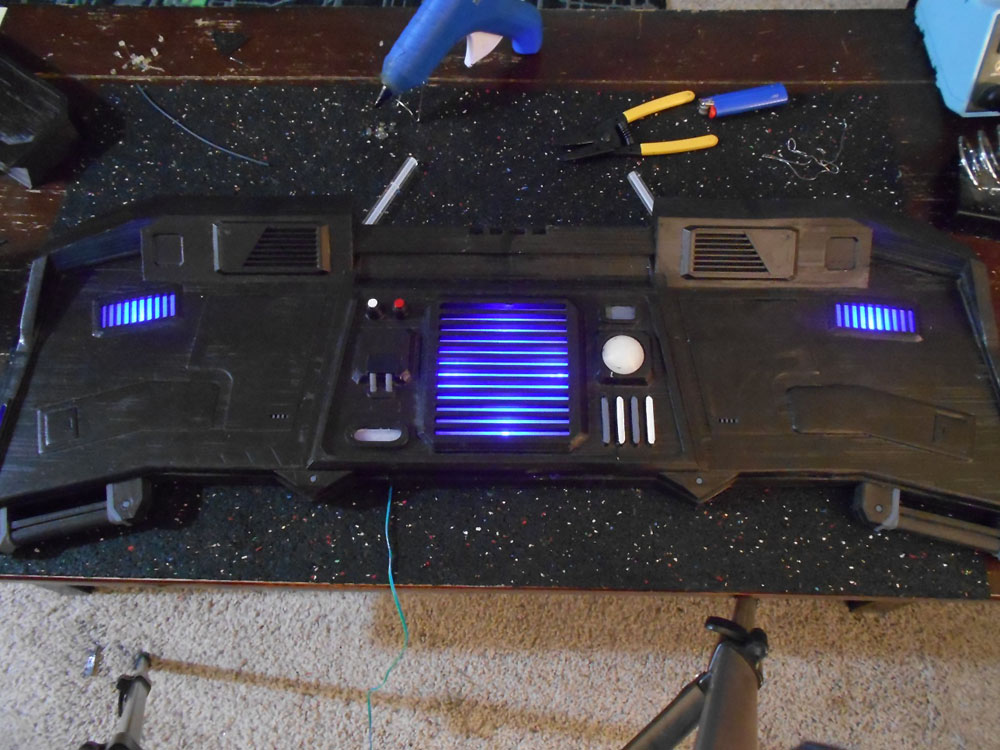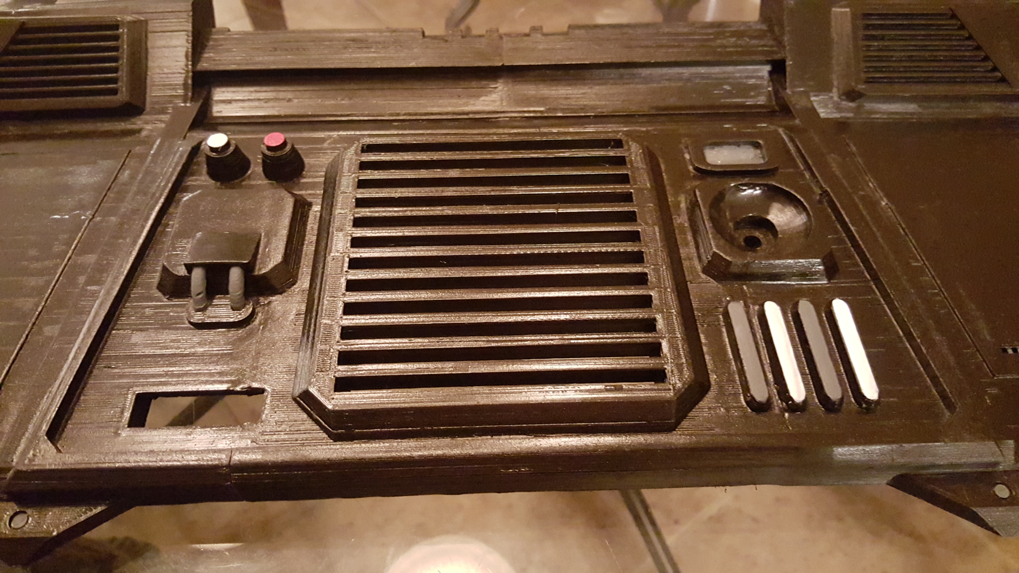 So, I finished the job and sent the console to my brother. It arrived last night and he was eager to get started with the electronics so he jumped right in. We are going to hook into the games sound system and log files to send the lighting commands to the various LEDs (he's using a PIC board he designed to control it). I had not had the chance to see it "lit up" in real life, but I saw in my head what it would look like with the LEDs. My brother did not disappoint me and I think it looks great. This is likely going to be the largest print I will ever do with the printer, requiring easily 200 hours of print time and countless hours modeling and researching the games layout of the console for this particular ship type.