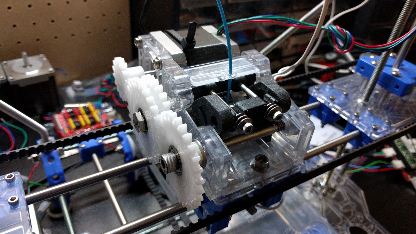 I rebuilt the extruder last night, another problem I found is that the little clear piece at the top and the black piece in the middle were slightly to wide. If I tightened the middle bolt down there was still a very slight amount of wiggle in the gears. So they were not getting the full lateral engagement that they were supposed to. I shaved a little bit off the edges of those two pieces and got it to where I could fully tighten down the middle bolt and have significant lateral pressure. After doing that and reassembling it the fillament feed is much better.