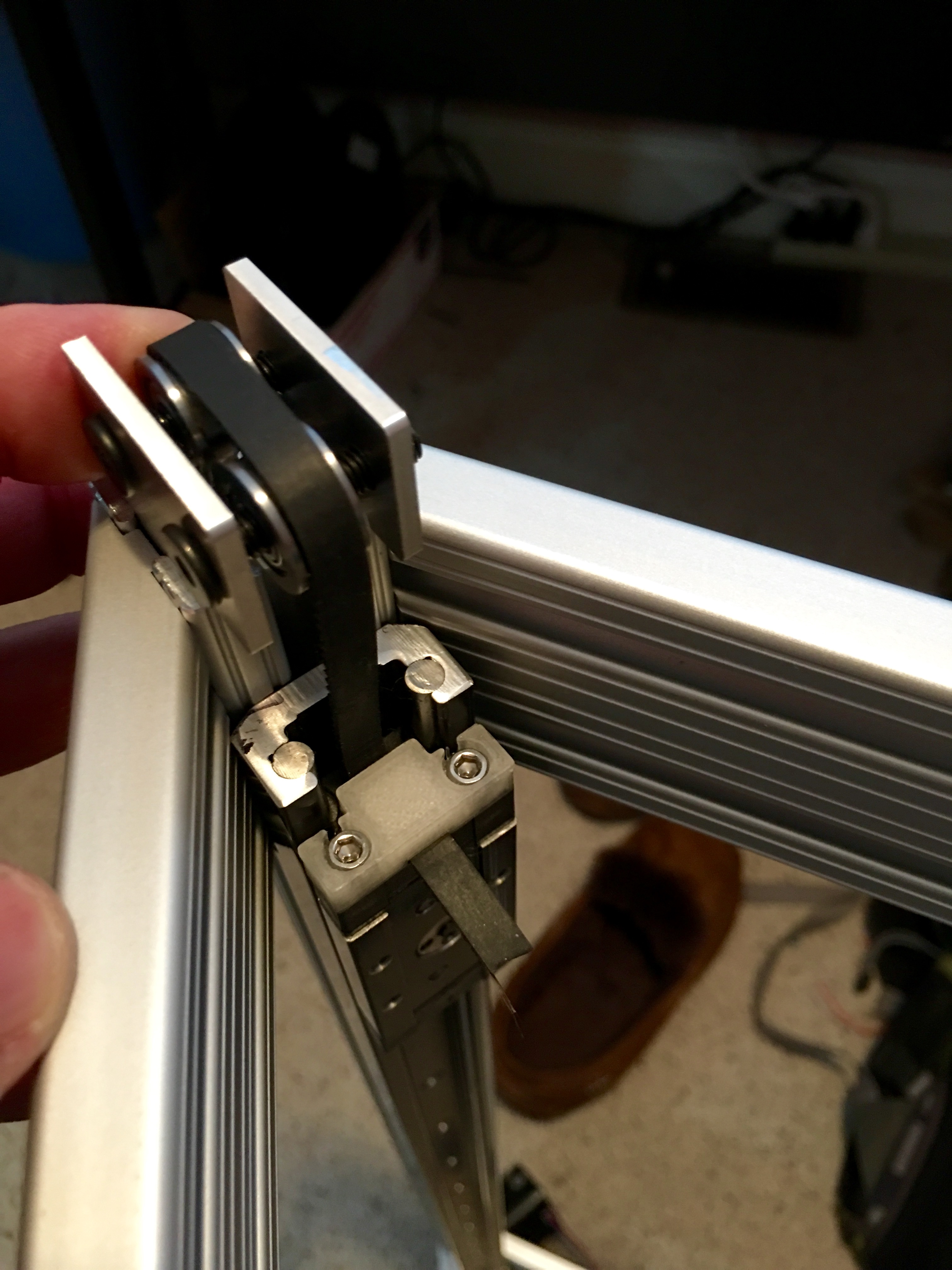 I've now figured out how to route the belt to clear my linear slides. I need to machine 6 "L" shaped replacements for the top bearing mounts. A smaller version of it can be used at the bottom. I'm also integrating a belt tensioner using a hose clamp at the lower edge of the linear guide blocks. I hope to machine these parts tomorrow.