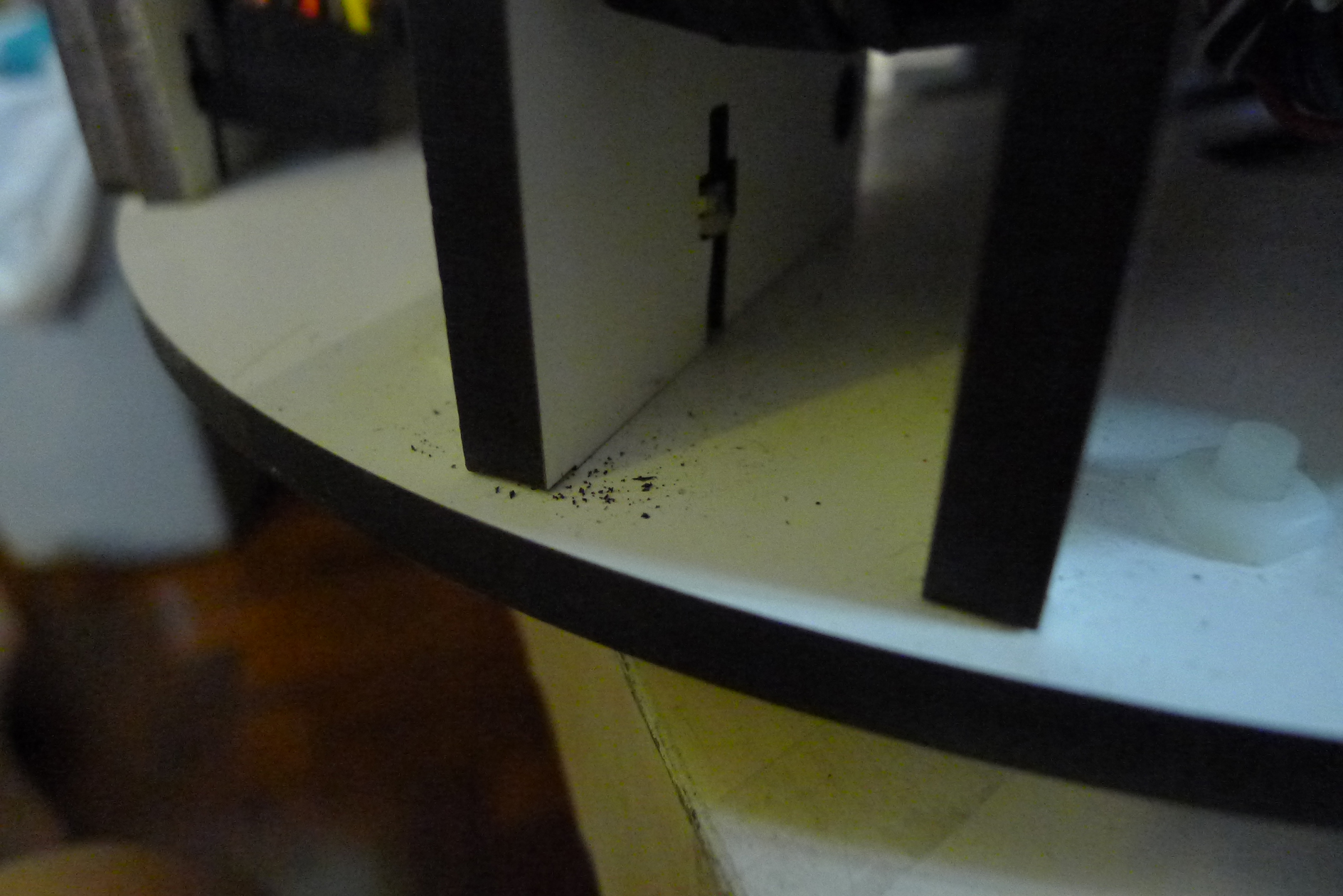 I did find some belt dust, not a lot, just some crumbs of rubber. There were more black crumbs around the X tower, both near the stepper and the idler pulley, compared with the Y tower, which had just a few crumbs. This seems to be in line with my observation that the layer shifts always seem to toward the left and slightly frontward, indicating the X tower/motor has the most grinding going on. I have attached some photos of the dust: