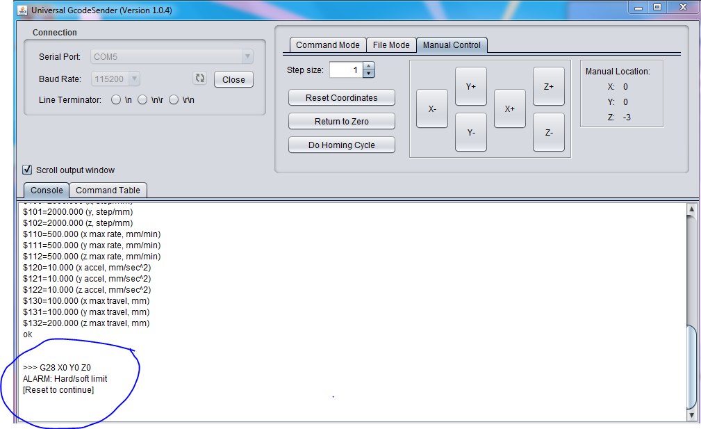 But when I try and manual control the printer it comes up as, "ALARM: Hard/soft limit," not sure how to progress here and am looking for help. I also tried Grblcontroller but the same problem persists.