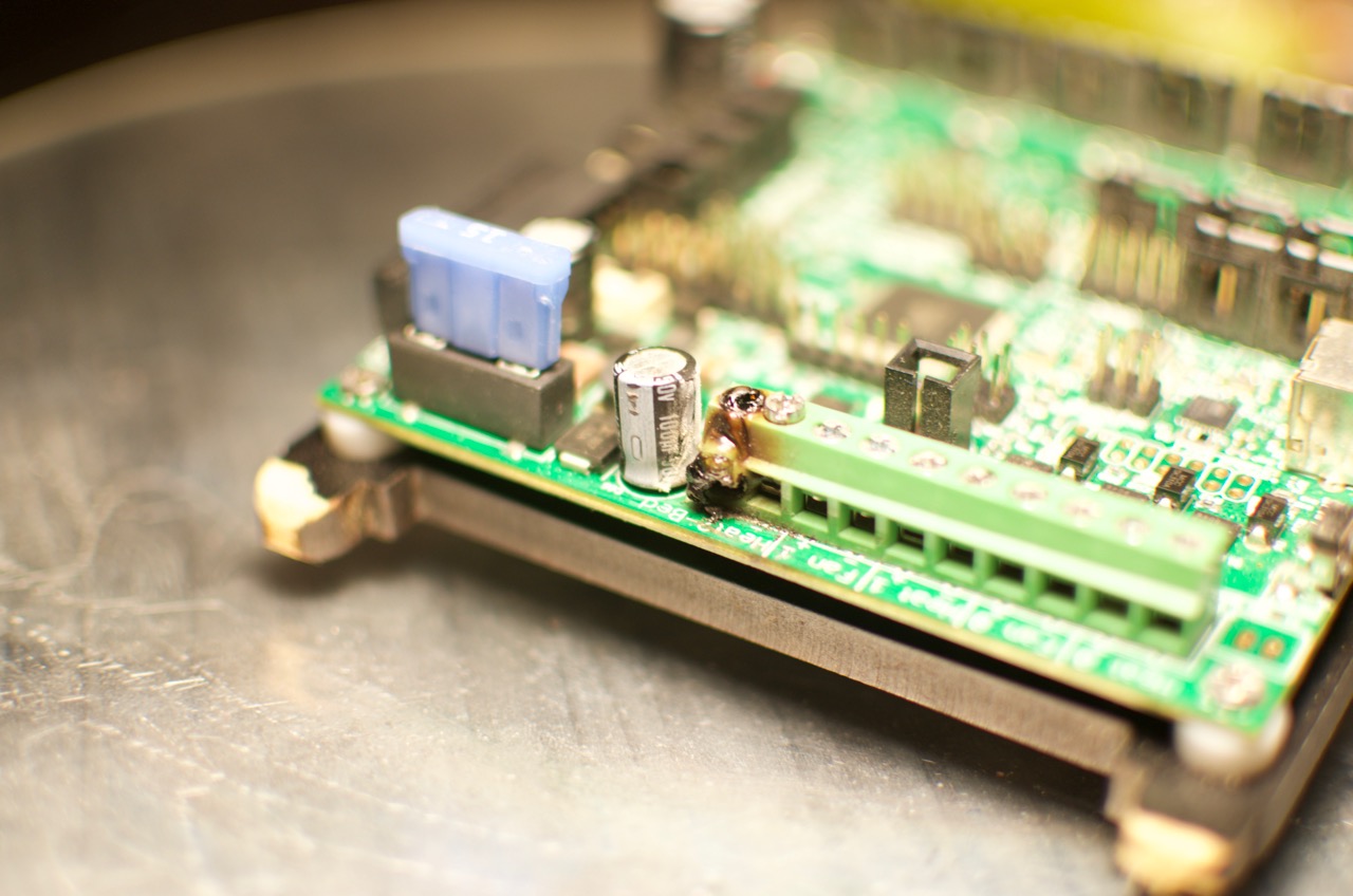 So after a year of no issues I have finally had a possibly very expensive mishap. As I was preheating my heated bed (PN 58742 R2) I started to smell a very unsettling burning smell coming from my printer. I opened up the front to inspect the RAMBo for the cause and found the root of the problem as shown in the following picture: