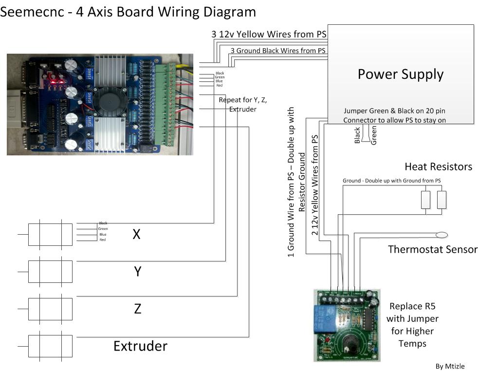 Hey mitzle. John here. You will want to bring 3 yellow 12V lines from the PS and 3 black gnd lines from the PS to the 3 axis board. Run seperate power/ground lines from the PS to the heater board, this will help with any signal interference. The axis board can be "noisy" and running the lines from the PS seems to eliminate this. Also, your hot end resistors ground wire comes back down and doubles up on the thermostat boards ground wire. That's fine. And you should have a jumper from the thermostat board going into the COM (center lug) on the relay terminals, and then the NO terminal runs up to the other side of the heating resistors.