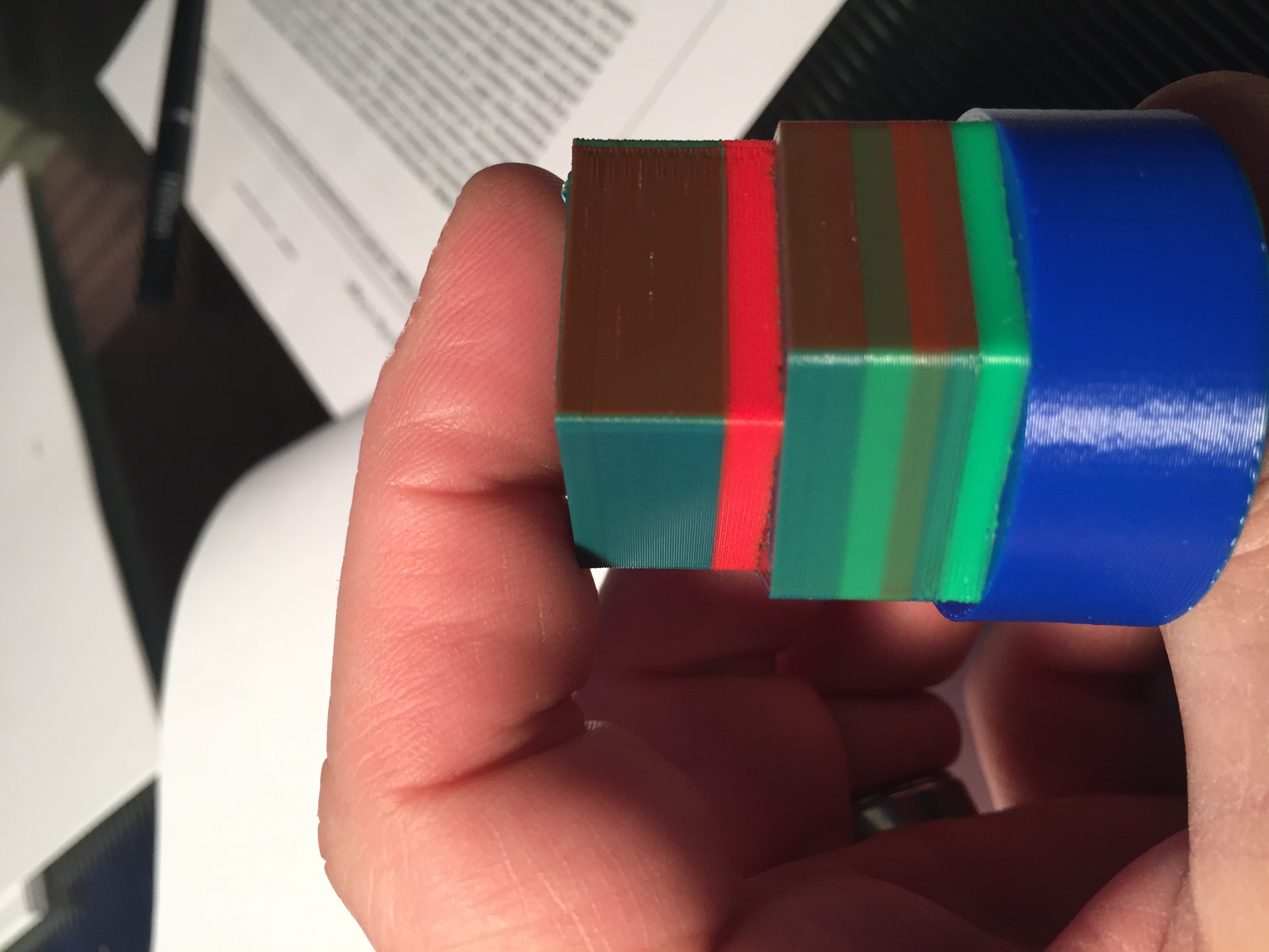 It is hard to see but from the top (slightly over extruded) you can see within an individual bead of extruded filament layering of the different colors. Look at the outer walls and you can see it best in the +/- picture.