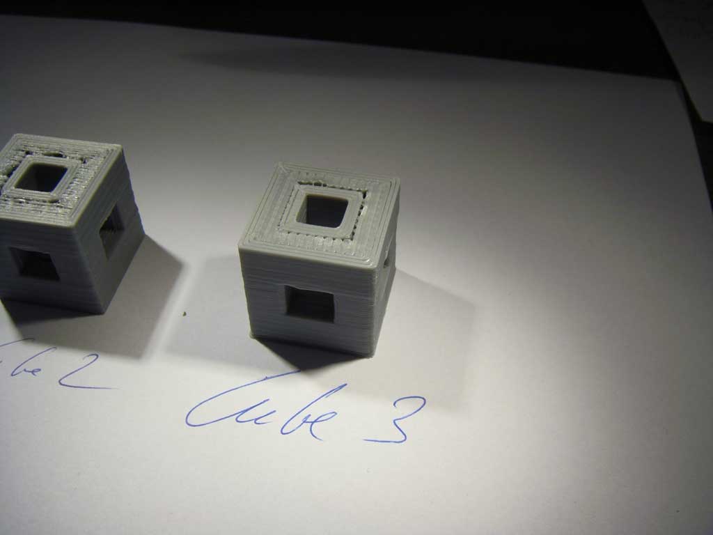 I just finished my Rostock Max some days ago and started with printing the Skeinforge Bridge Calibration Cube as recommended in the assembly manual. Apart from some slight gaps in the infill the machine seemed to work fine. But when I did a close inspection of the finished cube I found, that the view from above is out of square (it acutally looks almost like a parallelogram; I found that it is approximately 3-4 degrees out of right angle) and the four columns are approximately 0.5mm displaced. So I disassembled the whole carriage, reworked all the delta arm joints so that everything moves without friction. Then I printed the cube again - and the result was even worse. The second cube is even more out of square.