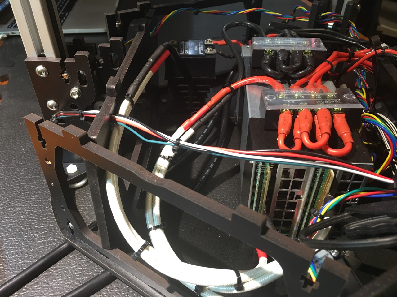Heat dissipation was one of the things that I was initially worried about, as these are rather beefy power supplies. With the sides on, it's a bit hotter than I felt comfortable for the long-term life of melamine. However, by just taking one of the covers off temps run at about 10 degrees over ambient, which I'm really happy about. I plan on installing a small fan on one of the sides as soon as I locate a .stl of one of the sides, since I'm terrible at best at design; anyone have a copy? Will run a 24v fan on a 12v tap to keep db levels low. BTW, the power supply fans (remember there are 2 of them!) are variable and combined are quieter than the peek fan on my E3d, which is a HUGE plus to me, as I am usually in the workshop when I'm printing.