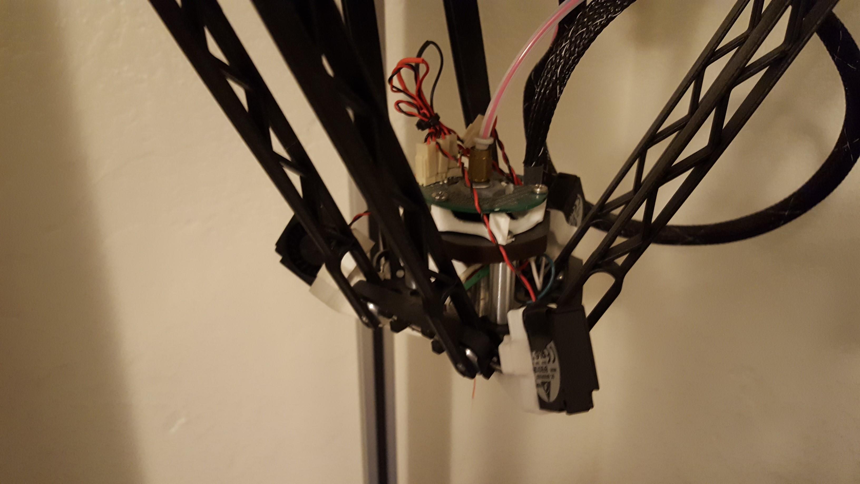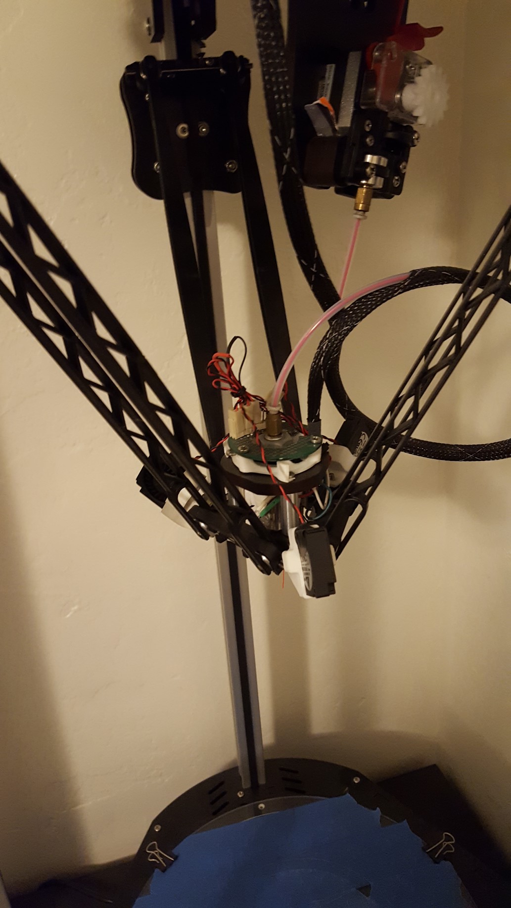 It's a Rostock Max V2, purchased June 2014. I have upgraded the stock power supply with a Corsair CX750M modular power supply. I have to say, that upgrade was not as straight forward as I would have hoped but it did make a huge difference in maintaining the nozzle temperature when the fans kick on. I have also installed two additional part cooling fans on the head. The total time printing reads 20 days and 6 hours; filament used is 4280.1 Meters.