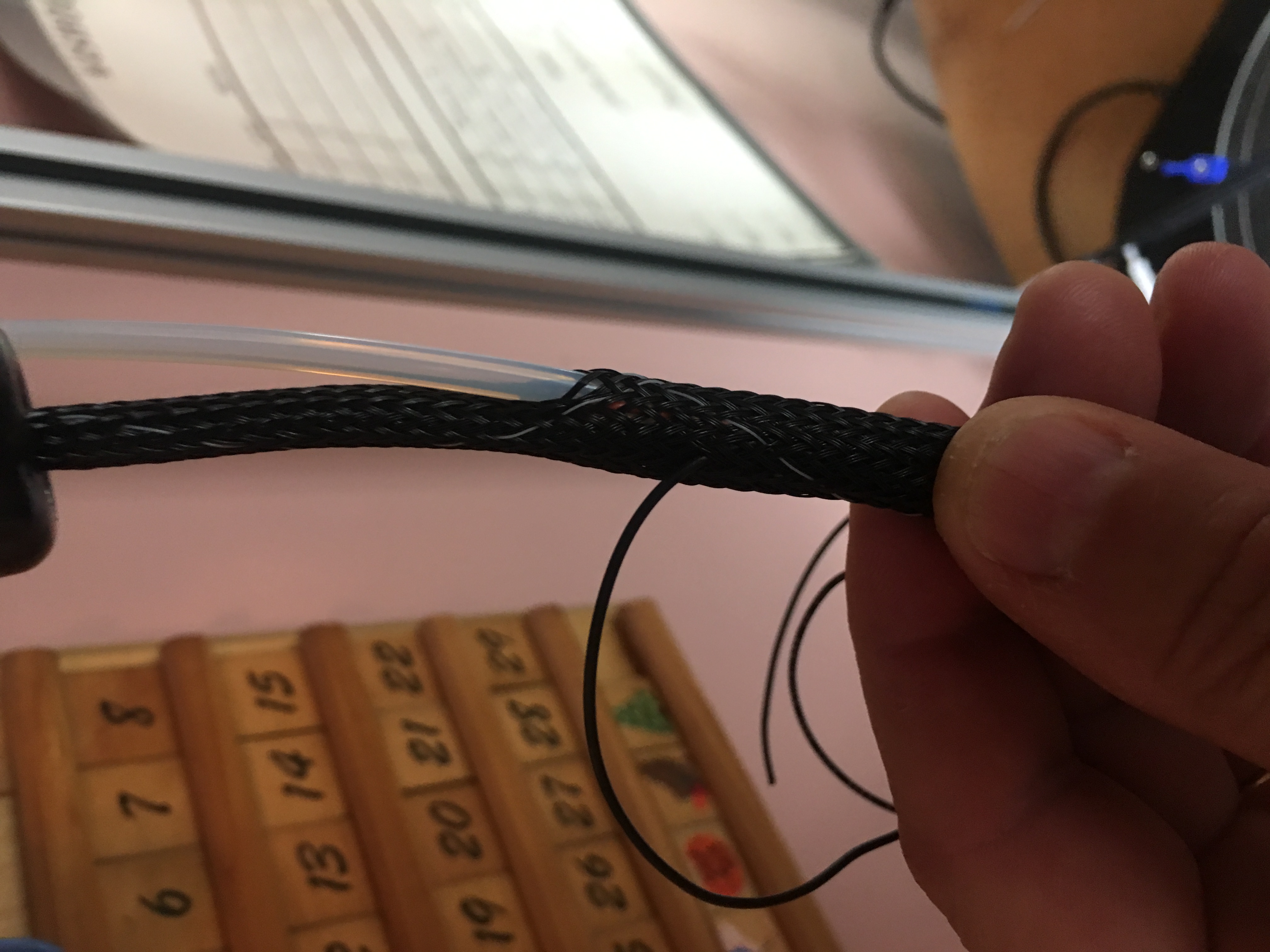 Disconnect the Bowden from both the extruder and hotend. Don't loose the little lobster claws! Now pass the 4' of wire INSIDE the Bowden from the extruder end until it comes out the bottom. Grab the wire at the top and then pull the Bowden out of the whip sleeve from the bottom near the hot end. Yes, you are removing the Bowden from the sleeve. This is all to make sure the thin black wire is inside the whip sleeve. If you come up with an easier way, chime in! Once the Bowden is removed, you have to put it back in exactly the way it came out (except without the wire inside it!). When you are done, you'll have the wire and Bowden inside the whip with the wire coming out of the side of the sleeve at the top like this: Next, unscrew the bulkhead connector that the sleeve and wires run through in the top plate. Also remove the top access plate. You need to loosen it all the way in order to get the wire through the fitting. Carefully find where the wire comes through the sleeve braid and push the end back through the same opening and up towards the top. The idea is you want to get this last foot or so of wire inside the sleeve, through the fitting and out of the end of the sleeve in the top. It is much harder to describe than it is to do! Once the free end is visible in the top, grab it and pull out some of the slack but make sure NOT to pull the lower end up into to the sleeve.
