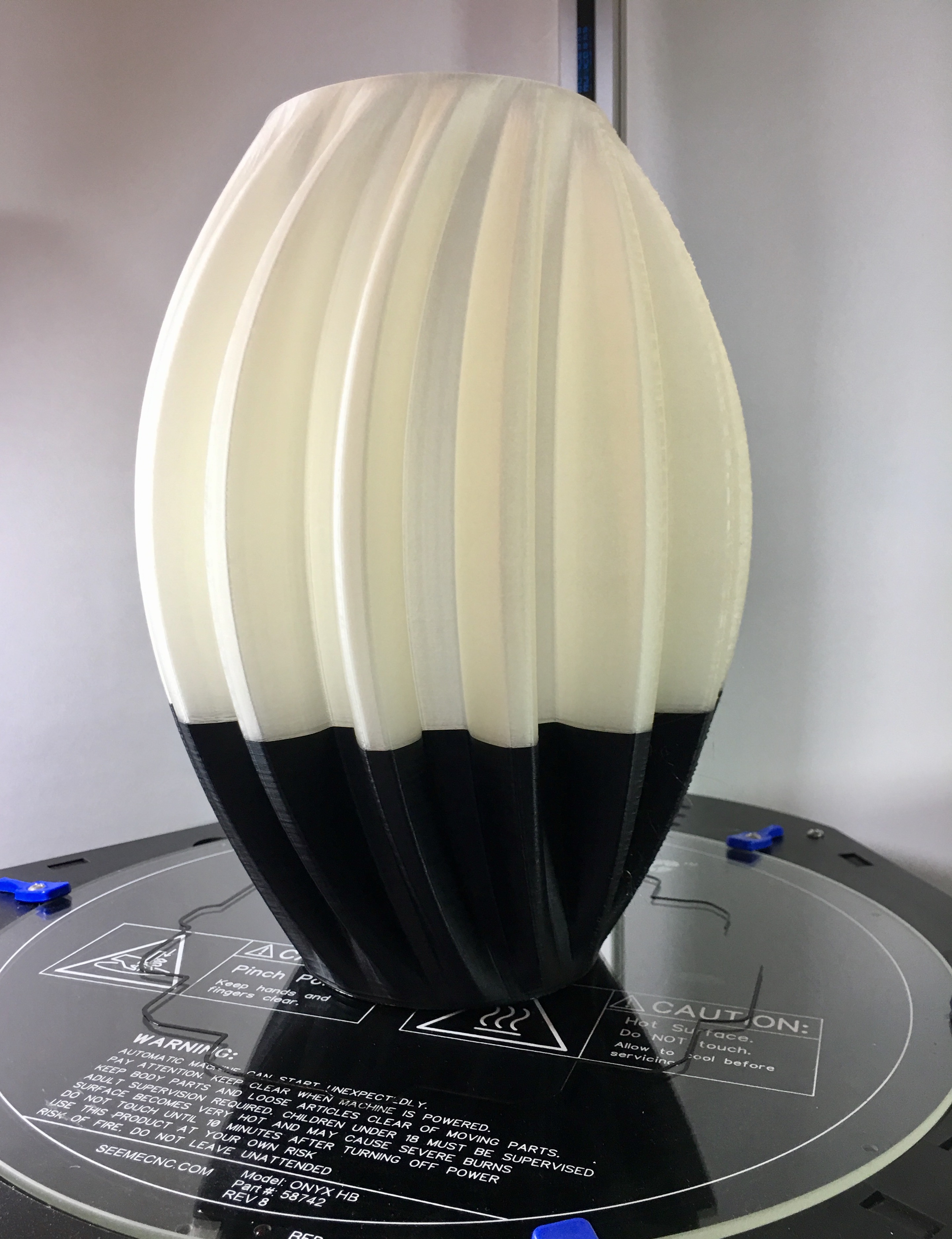 Stock V3, 0.7mm nozzle, black and natural SeeMeCNC PLA filament. .35mm layers, 2 perimeters, "Vase" setting in KISS. 195°C with 60°C bed on bare glass. 250mm/10" tall. It glows in the light.