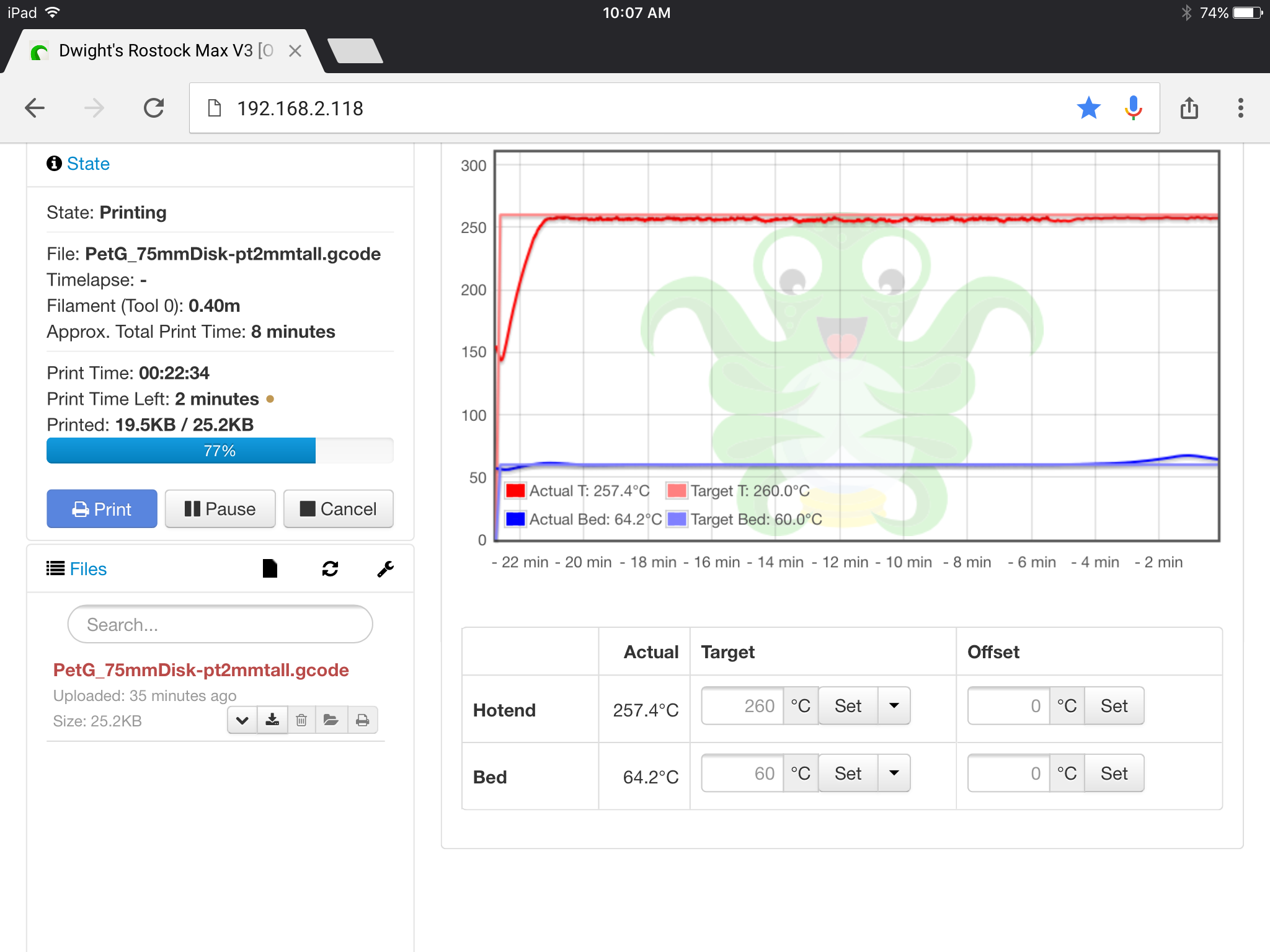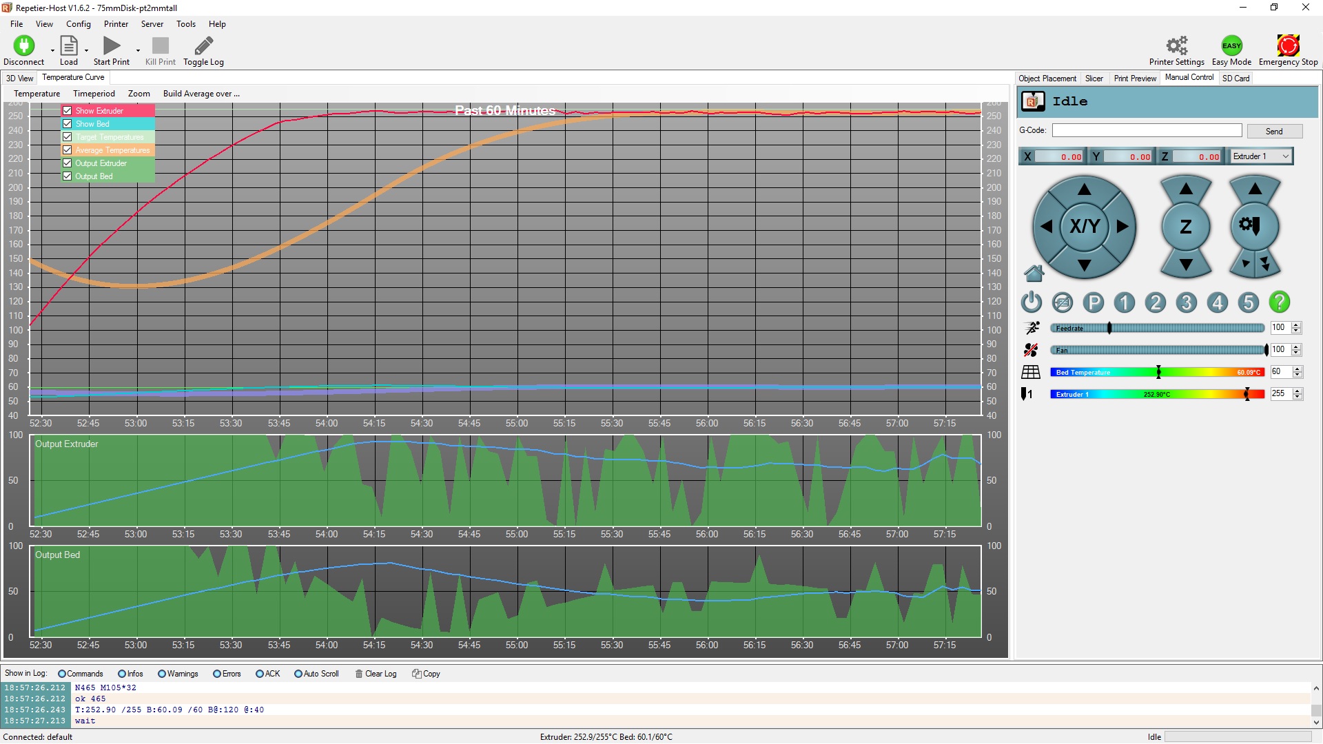 So, really a person should preheat separately prior to sending a print to get past that overshoot if the surface temp is critical. Interesting, it looked solid after it came back down as it should.