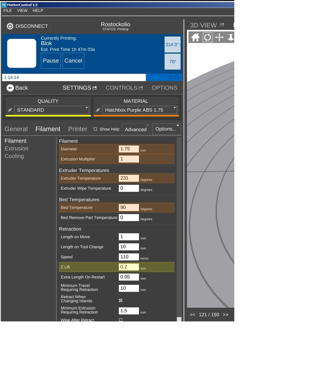 OK....so I have had the printer (Rostock Max V2) for about 2 years...and it's been printing fine. I print almost exclusively ABS, but I got some PLA and wanted to play around with it. I changed the settings in MatterControl and saved them as a preset and started printing, I noticed that the temperature of the bed and the nozzle were still the same as before I changed them. I stopped the print and checked my settings....the settings looked good...I rebooted the printer and restarted MatterControl to no avail. The printer won't go to the new temperatures. I can force the printer to go to the settings I want either by using the screen on the front of it, or by manually typing in the values in MatterControl Target box...but as soon as I click print the temps change to 220 and 70. Does anyone have any experience with this? Hopefully I am just missing something when I change settings. Also I switched back to ABS and am printing some test cubes in the screenshots.
