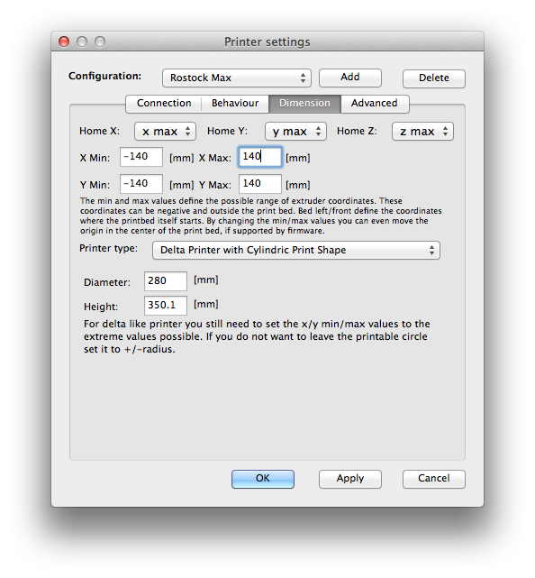 When I open Repetier Host and home the printer everything moves to the top as expected, but the manual control panel reports the current position as X: 280, Y: -280, Z: 0, which is very incorrect. My best guess is that what ever is controlling to homing logic doesn't realize it's a delta printer. I've confirmed that DRIVE_SYSTEM is set to 3 in Configuration.h, any help would be greatly appreciated.