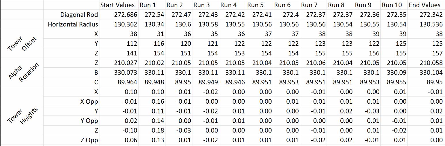 I used your program with just a dial indicator and adjusted everything within .01mm. Then I installed my hot end with the wires and tube, the opposite tower ends were still out but a lot closer then anything I have been able to get in the past. I believe adding the cables and tube showed me my extruder slop even with bands on the arms.