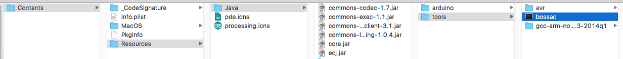 I just finished setting up my Duet using Arduino version 1.6.1 on OSX from https://www.arduino.cc/en/Main/OldSoftwareReleases and it turns out the file in that version is at3D-Print wrote:Interesting that the "Java/......" Folder and subfolder is not present on my computer. Not sure if this is why I was having in consistent problems.IMBoring25 wrote:I'm not sure what arguments and/or permissions that shell script might need. The instructions I've been using to flash mine came from the RepRapPro site, where they call bossac directly, the Mac command being: