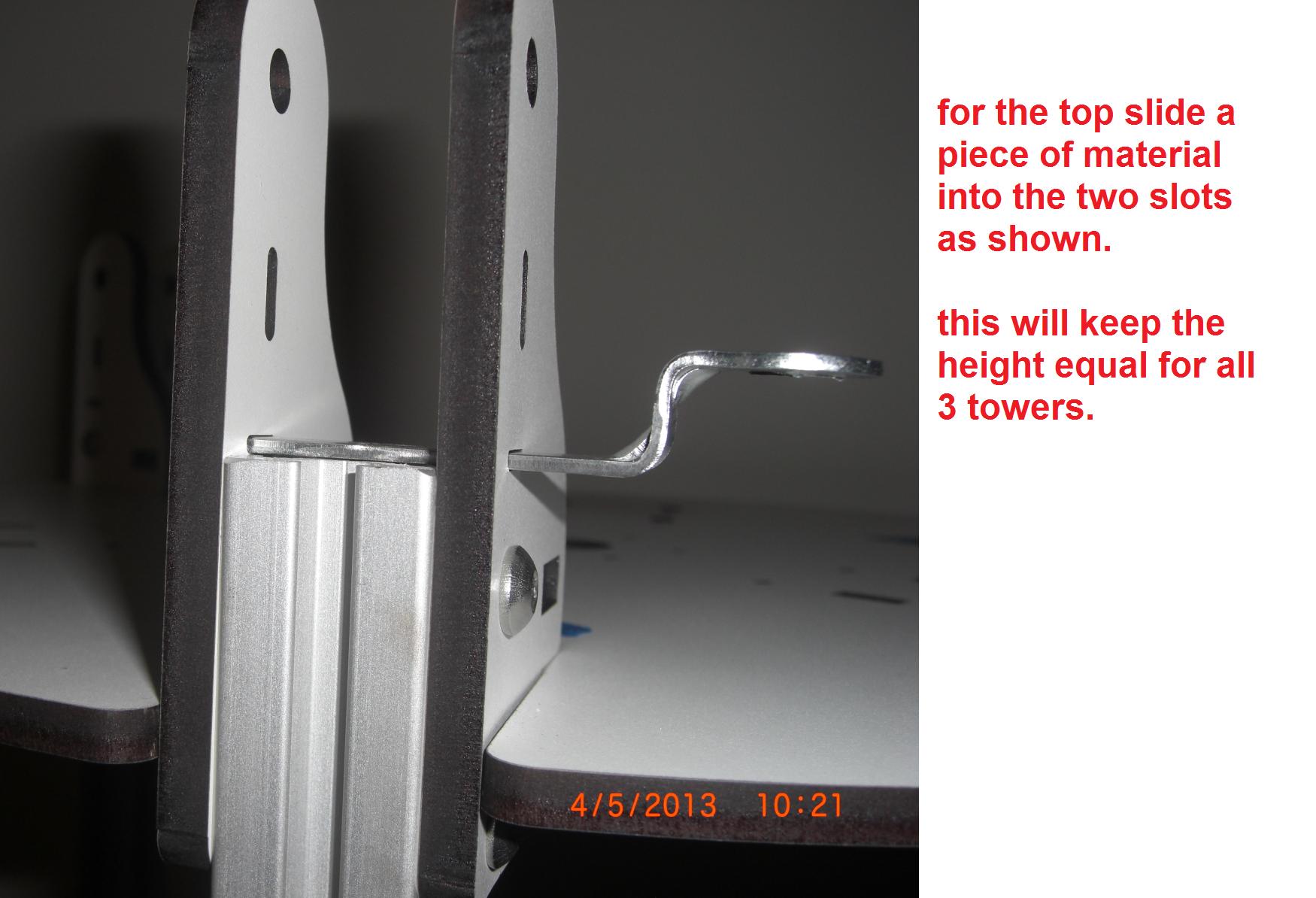 Once done all three towers will be at the same height and perpendicular to each other. Oh yeah, DONT FORGET TO REMOVE YOUR ALIGNMENT TOOLS (IE. T-SLOT NUT THAT YOU USED TO ALIGN THE BOTTOM AND THE MATERIAL YOU USED TO ALIGN THE TOP