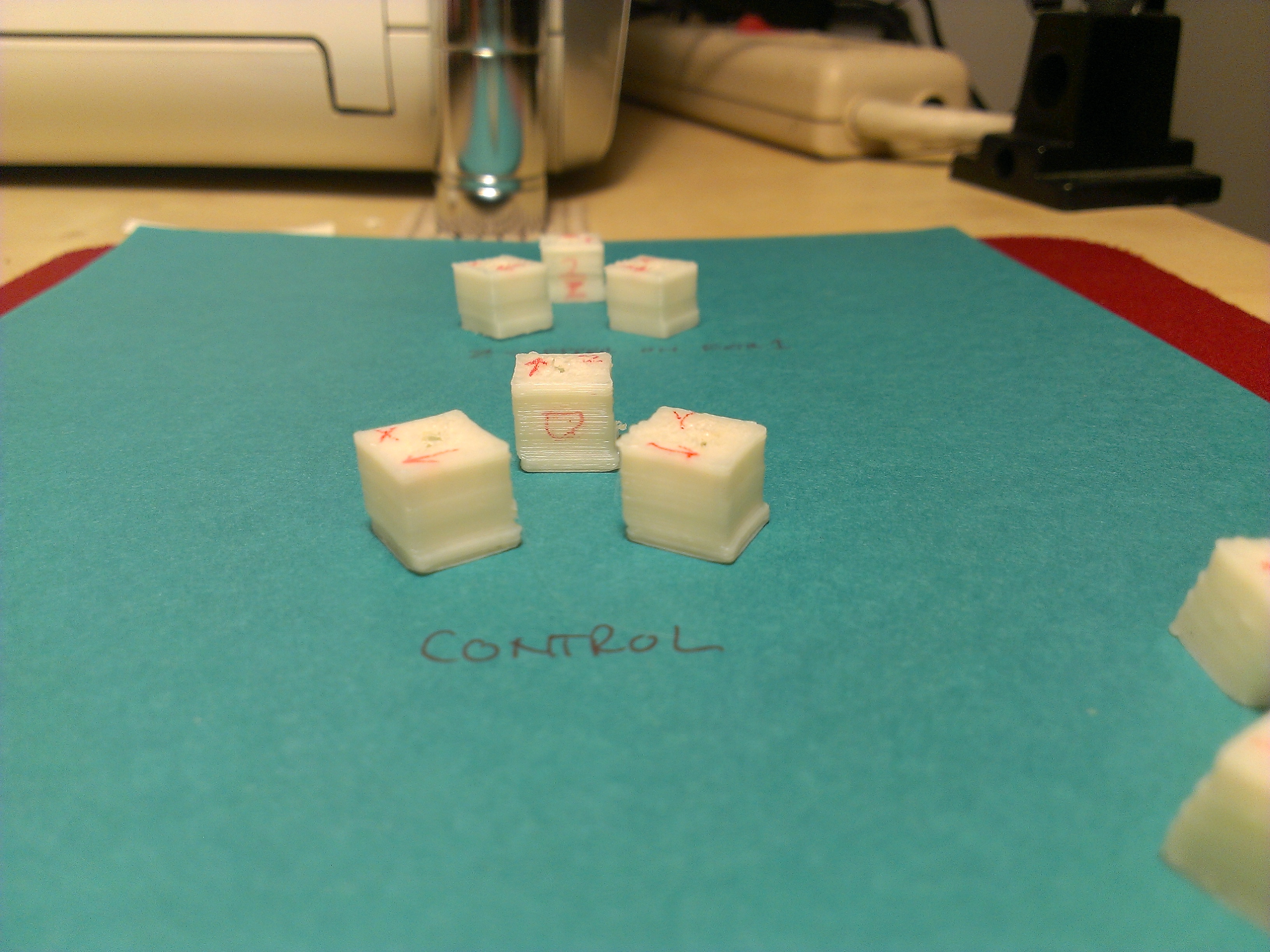 So here's the results of the pin swap extravaganza. In openscad, I created another test pattern so I could better see differences between each change. It's just three 10mm cubes arranged in an equilateral triangle, with faces facing each tower.