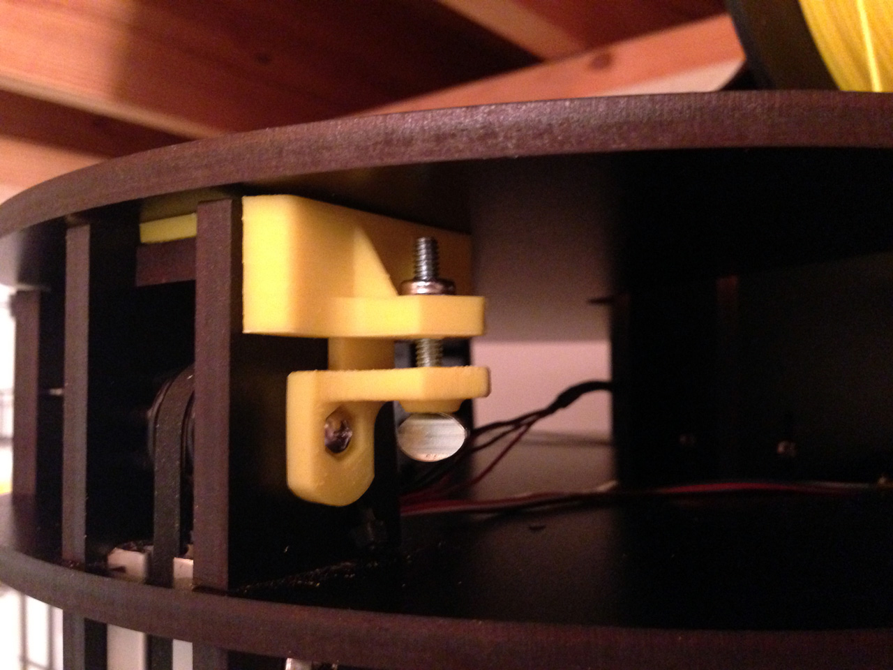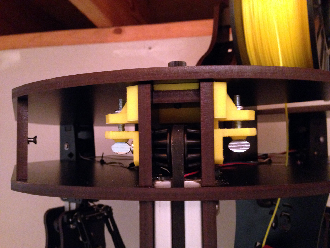 I wanted something that would install easily, allow easy adjustment, and minimize risk of damage to the printer. The top bracket installs by simply removing the nylon thumbscrew at the top of each tower. Once removed you'll notice that the top tensioner bracket will slide right into the gap that is present between the top melamine plate and the horizontal support for the tower supports.