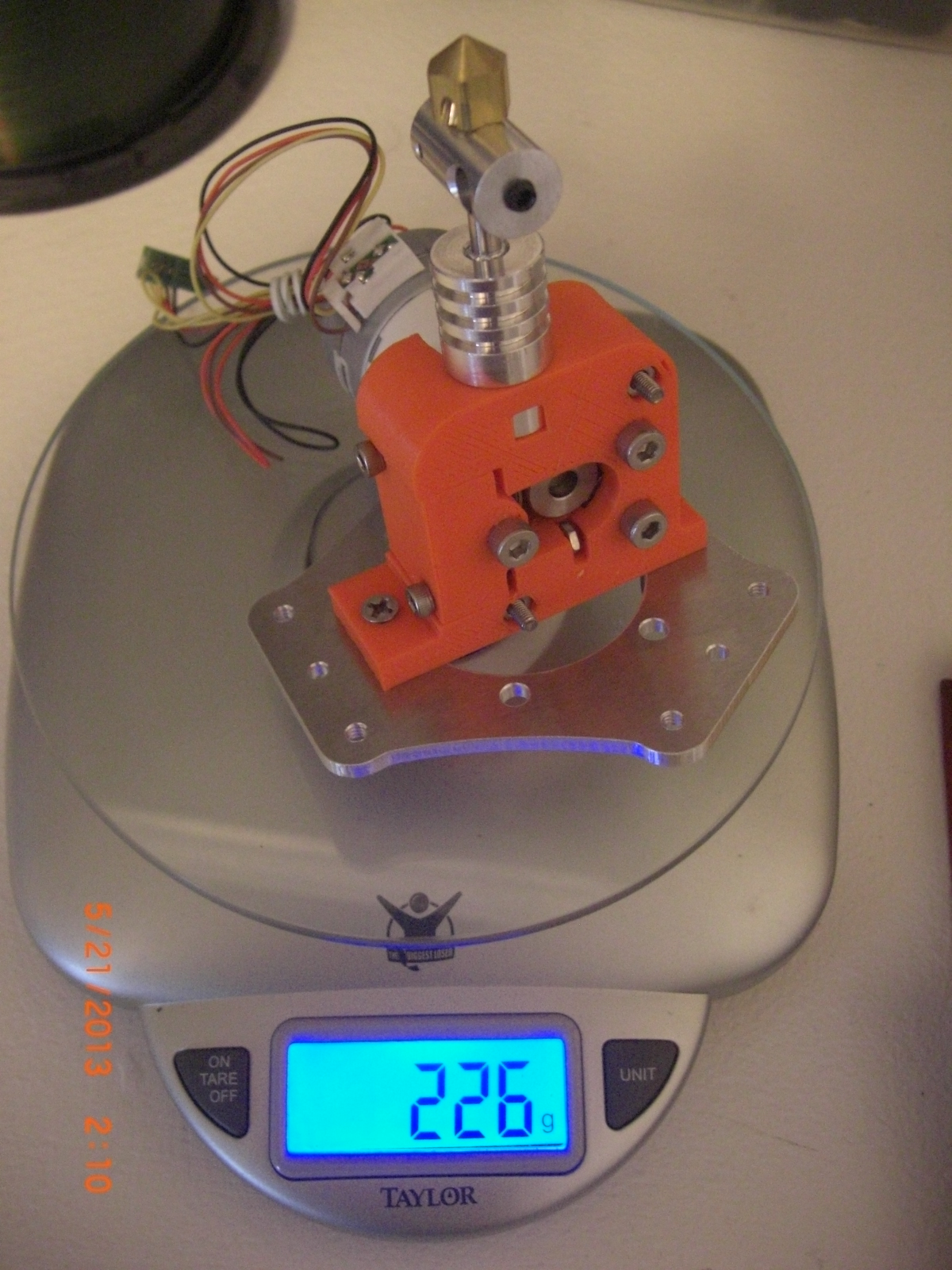 compared to the weight of stock stepper of 332grams. this weighs about 226grams, around 240grams with the magnet ball joints installed. not to much lighter but with all the fans/heatsinks installed it should still be under 300 grams.