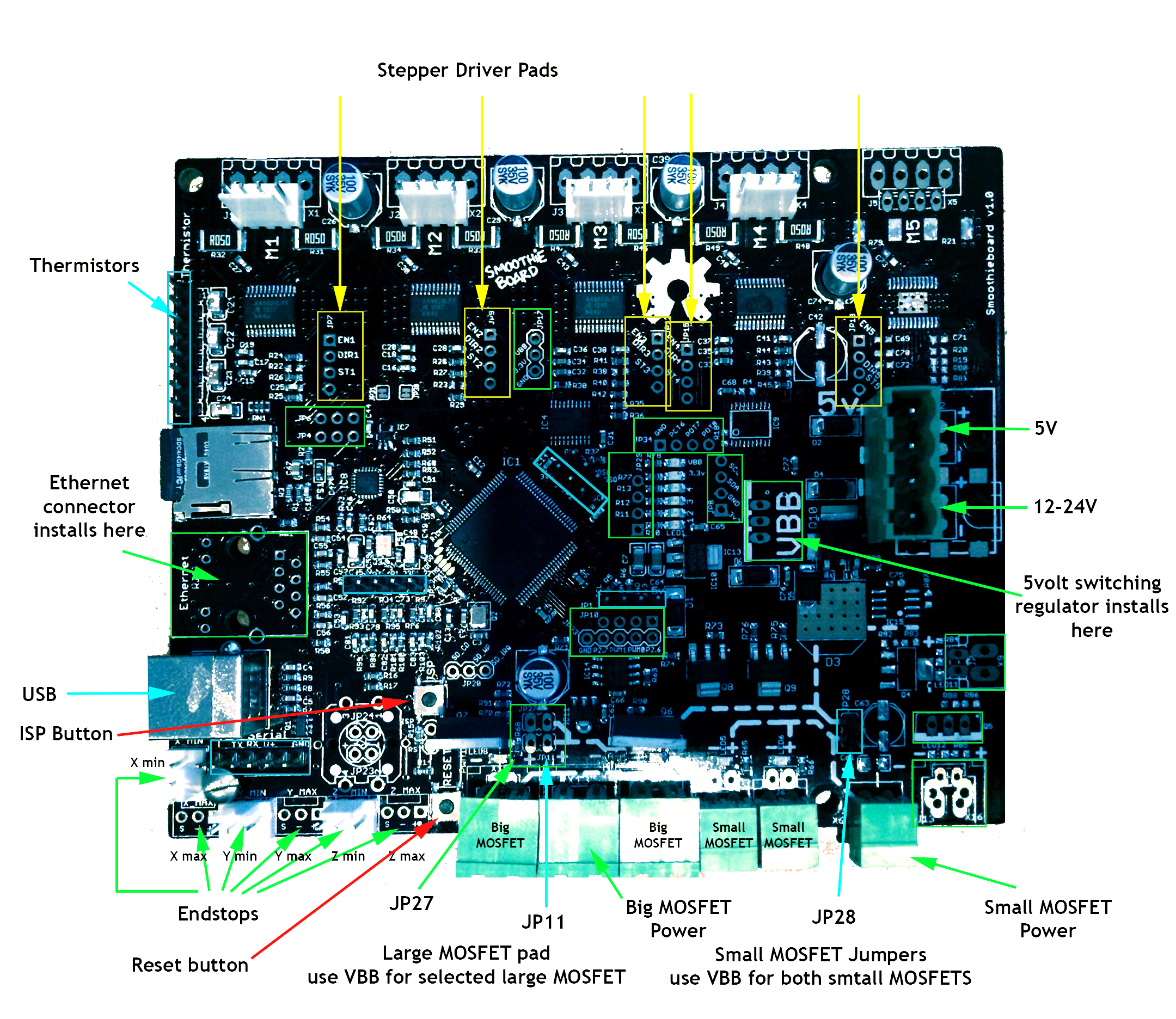 I'm finding the lack of documentation on the Smoothieboard production layout to be frustrating. I purchased the optional 5V switching regulator that is supposed to install on production boards and can't for the life of me figure out where it goes. I also read on the smoothieboard page that there are jumpers to power the MOSFETS from VBB without requiring a separate supply at the edge connectors or jumping (with wires) to them. Again, can't for the life of me find these. The "documentation" refers to a "non-border connectors section below" which does not have a diagram. With a little google detective work I could find the equivalent diagram for the beta boards but it doesn't really match the production boards. I'm thinning I should have gone with the X5, it has some very nice docs and connection diagrams. the smoothieboard came with 3 strips of pins that I have no idea what they are for.