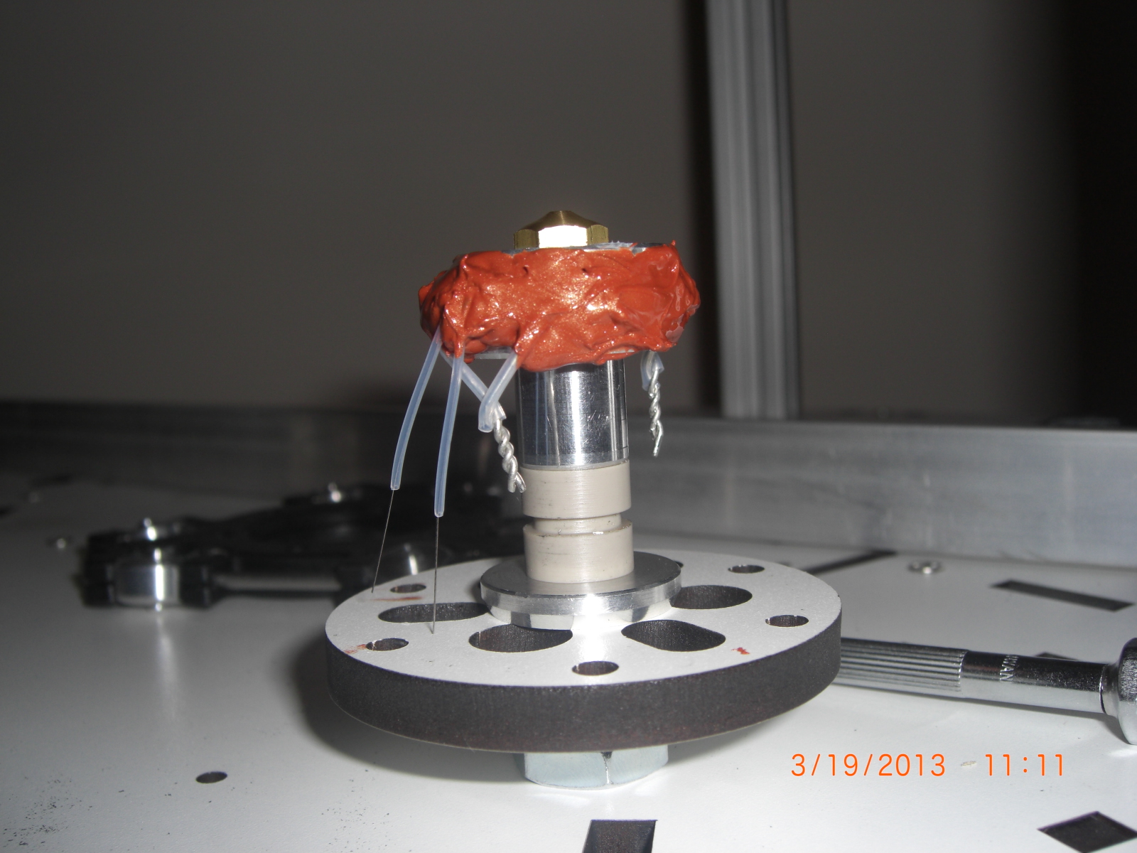 to keep progress moving along I continued work on the hot end and the ujoints for that area. The assembly of the hot end ujoints actually went a lot faster then the cheap skate ujoints. Seemed like the hot end ujoints were a lot easier to sand and didn't require to much effort. Assembled the hot end tonight. took some pointers from the forum and used teflon tubing to insulate the thermistor and the resistor wires. Then laid a layer of high temp rtv on it. I wasn't going to use the rtv originally but it was about the only thing I could get locally so rtv it was. I'm still trying to get a hold of some resbond 920 to use later.