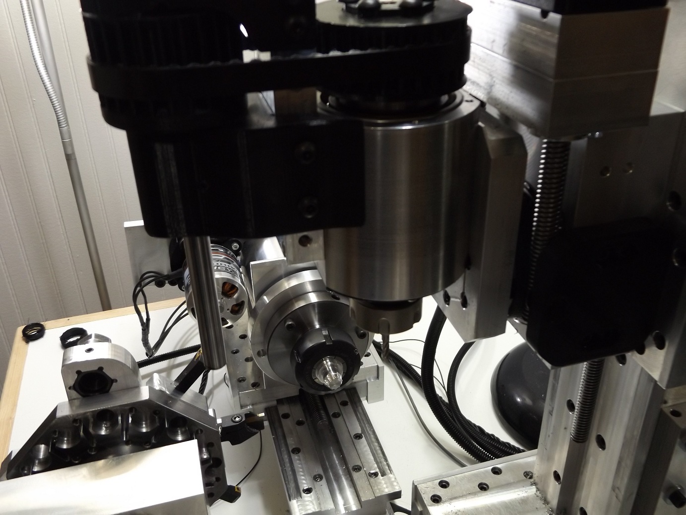 Another update on this thing. I haven't gotten that much done in the last few weeks on it. It can turn, thread, and mill parts in an ER40 collet or a 5 inch 3 jaw chuck. The spindle is eccentric by about 0.00015" or 3-4 microns because I used cheap non-precision bearings, but that's actually better than I expected. Static rigidity at the spindle nose looks to be about 40,000 to 100,000 pounds per inch of deflection, which isn't as good as full sized machines. I blame the thin-walled aluminum body tube for this floppiness.