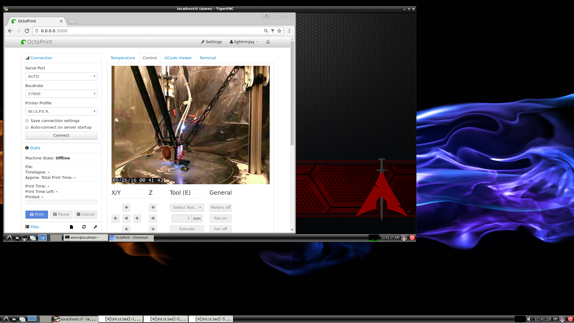 Thus, I now have a new development device to do fun things with! I used an android application known as Linux Deploy to install Arch Linux into a chrooted environment which can be VNC'd into. Once I had accomplished that, I loaded Octoprint into Arch Linux, purchased a USB C OTG cable in order to allow my phone to be connected to the printer, and then fiddled with file permissions on the serial device /dev/ttyACM0 (which on linux turns out to be used for our printer communications over USB).