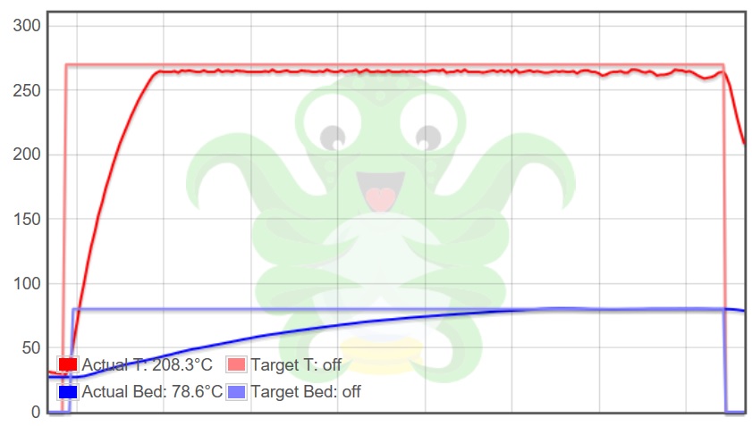 So, really a person should preheat separately prior to sending a print to get past that overshoot if the surface temp is critical. Interesting, it looked solid after it came back down as it should.