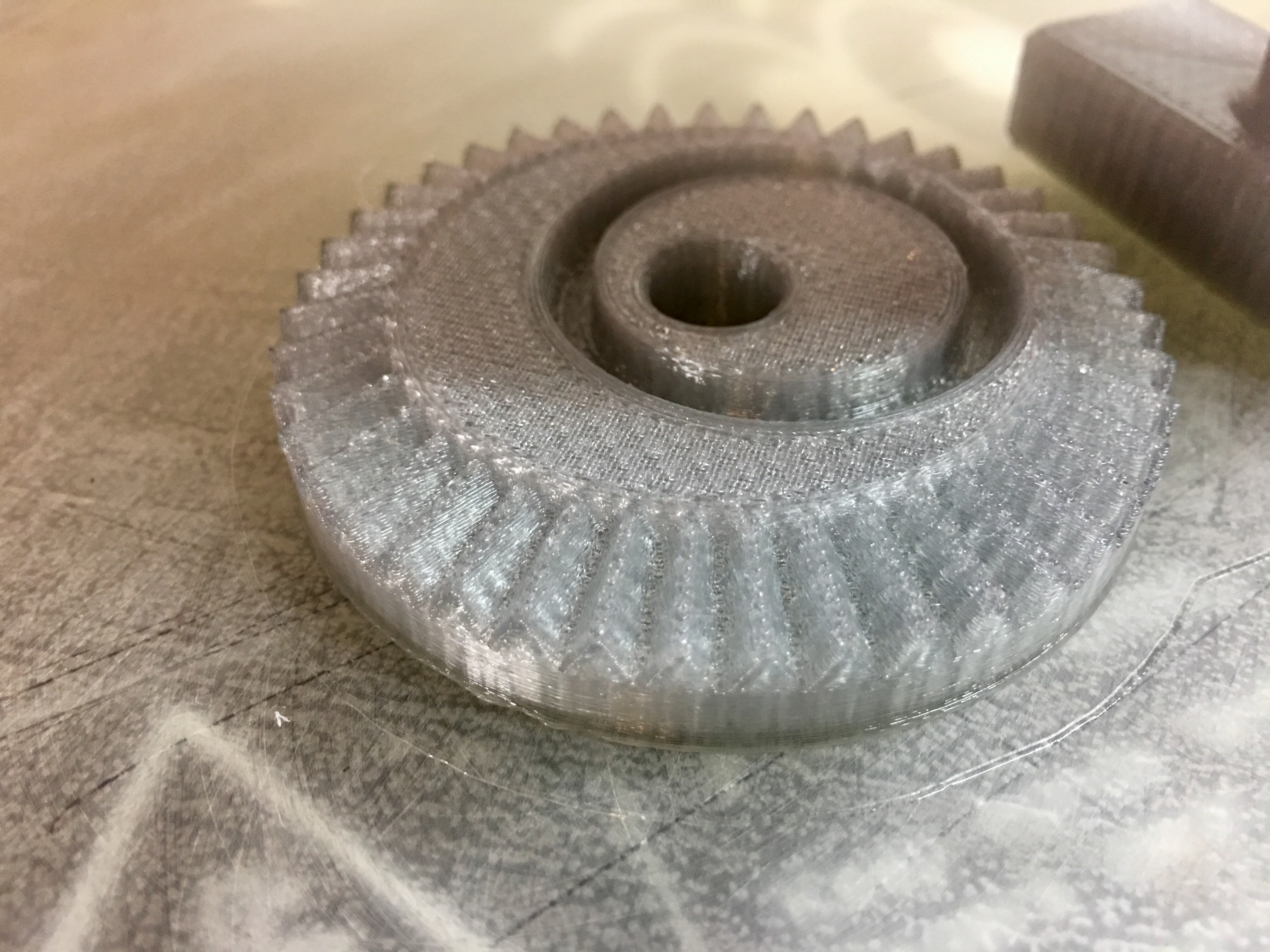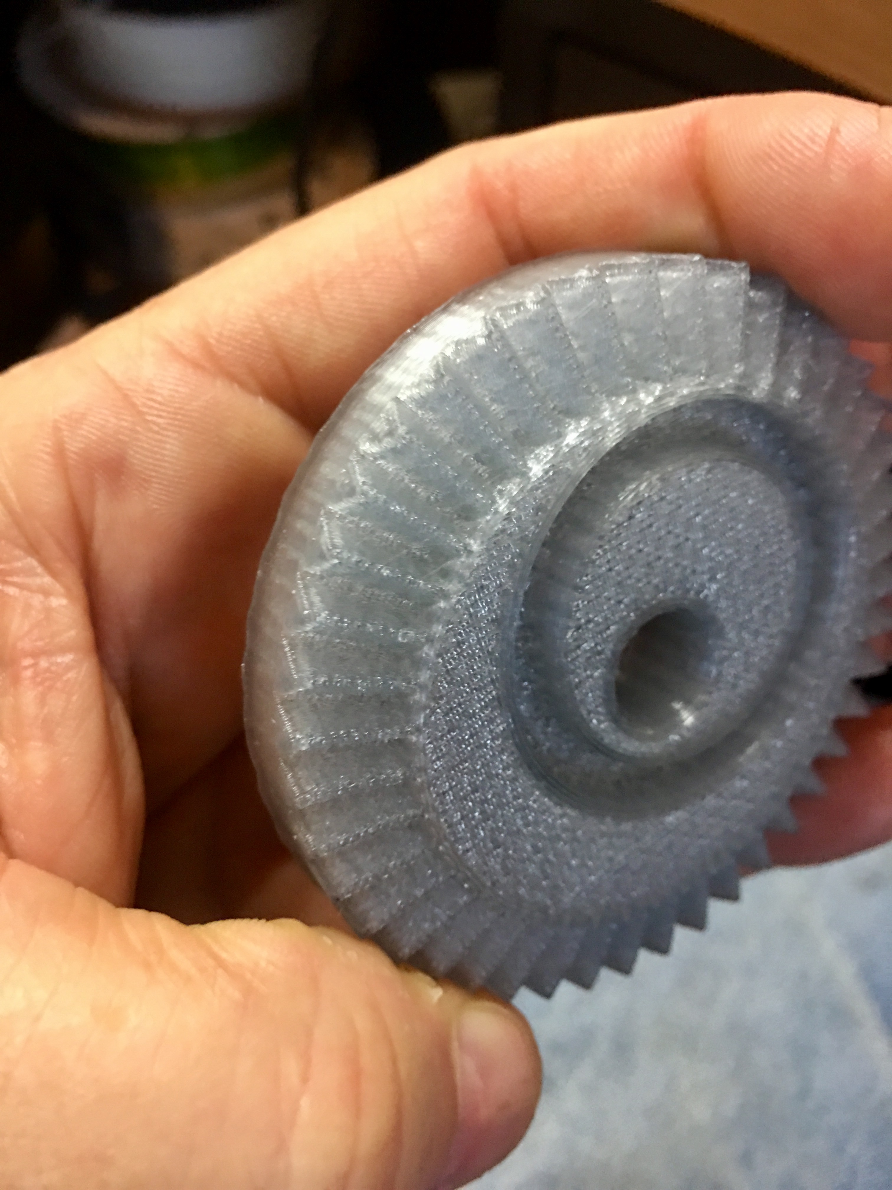 This gear is extremely difficult to print without a LOT of stringing between the gear teeth. There are 1000s of short segments followed by short hops. A challenging part to print cleanly. This photo shows a very good part printed on my Rostock MAX V3 with a 1.8mm ID Bowden and Bondtech QR extruder with a E3D V6 hot end. But as good as it is, you can see the little wisps of filament strings between some the teeth (click the photo for high res view). This part was printed on the same printer but with the Titan Aero direct drive. Same g-code and same spool of filament. In other words, a very good 1-1 comparison test. Not a hair on its Chiny-chin-chin (or is it toothy-tooth-tooth?)