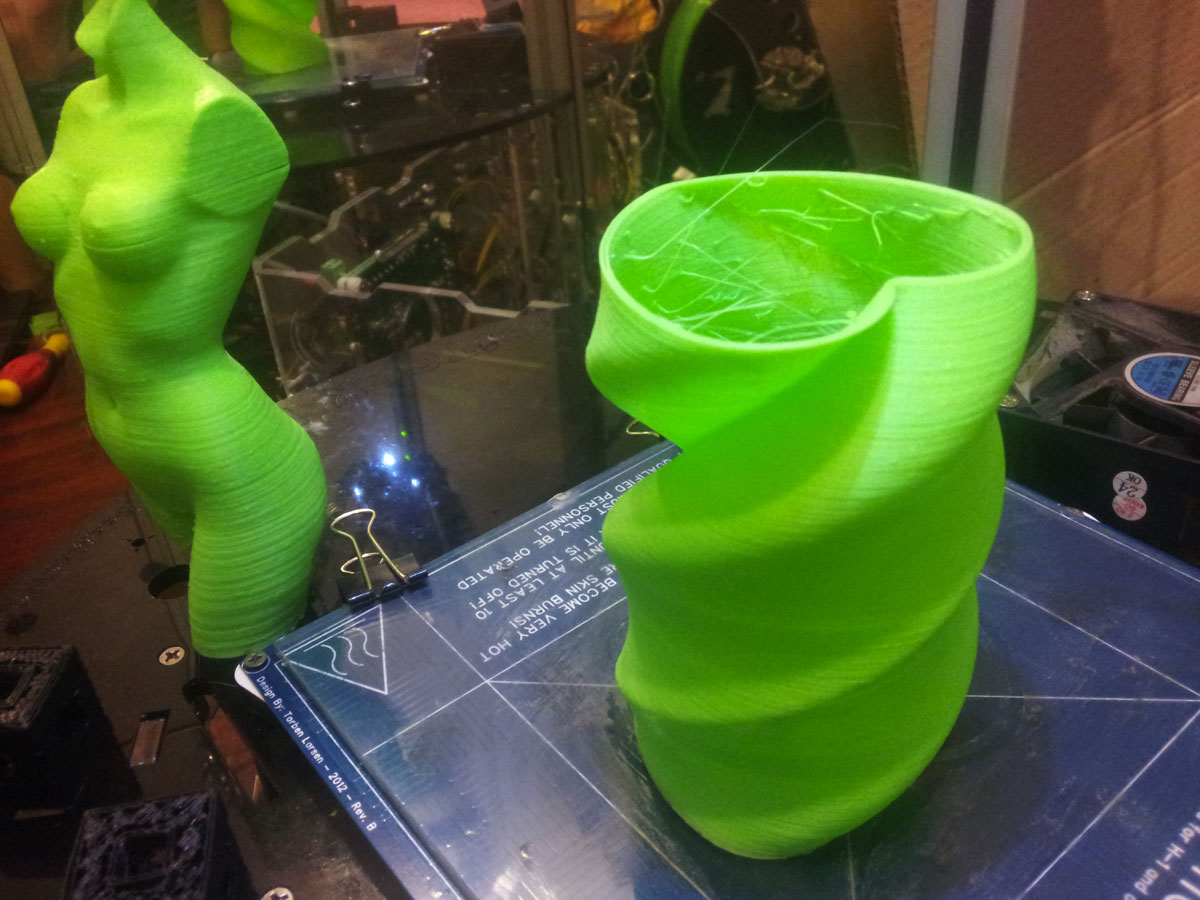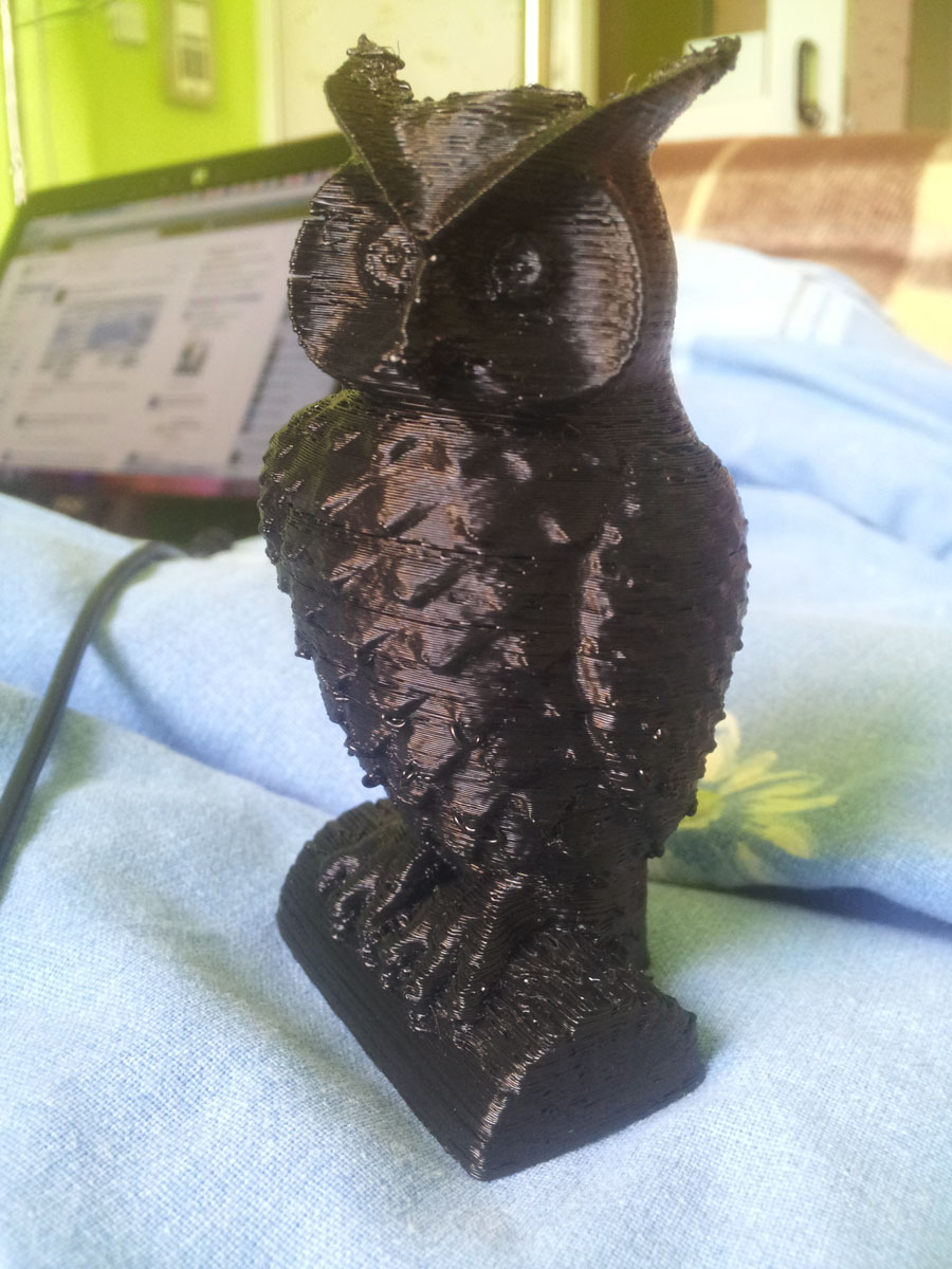 Here is my machine I will name it stage 1: here you can see the my very first prints I use setting from manual: after printing a lot of calibration cubes and stuff i want to do something else, owl an bear. ( not calibrated extruder at all) when I was bored of black color I changed filament to green, and all things goes a lot smoother (big difference i nozzle temp between them too I think at the same time i changed firmware to repetier): After that I try to calibrate extruder to get better infill (change e steps from 292 to 305), and I spotted problems with detached infill, so after Mhackney's tips i redo the u-joints. i take piece of metal 8mm thick ( the same as u jonts) and try to slide it in the arms. They are right now very smooth.