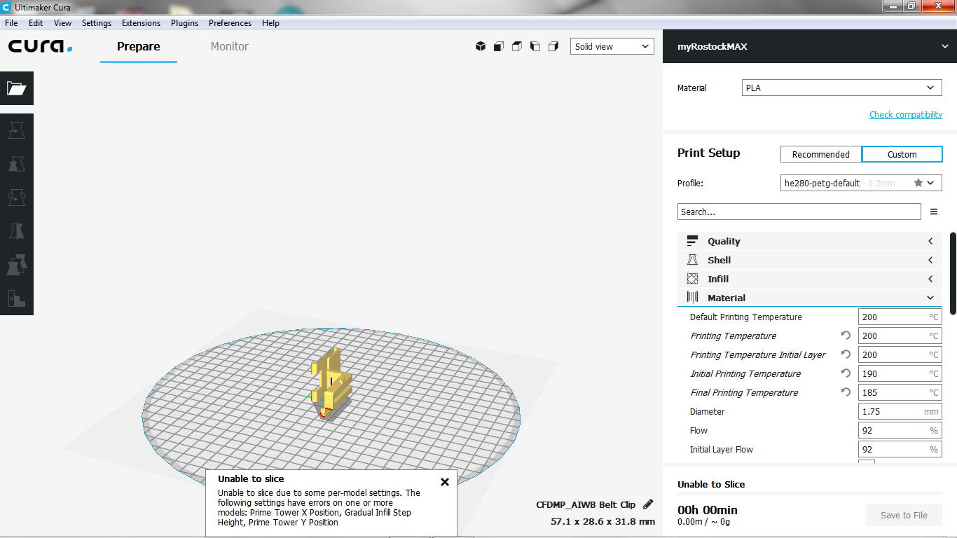 Next, i downloaded and installed Cura v3.3.1 and installed on my computer. Setup my printer, extruder and profile. When I open the part I want to print, I get error that says 'Unable to Slice' (see attached pic).