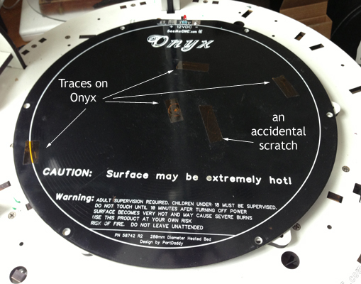 It's also prudent to insulate the edge of the electronics pad opening "just in case". This is the backside of the plates I sell, they come with the opening taped, some extra Kapton to insulate the Onyx traces, and longer 1" x 4-40 screws to hold it all down. Note the random pattern of scratches on the backside, they are unique to each plate and engineered to most effectively transfer heat ;) (just kidding, they are a manufacturing artifact) The front side is burnished with a scotchbright wheel to create a grippy print surface.