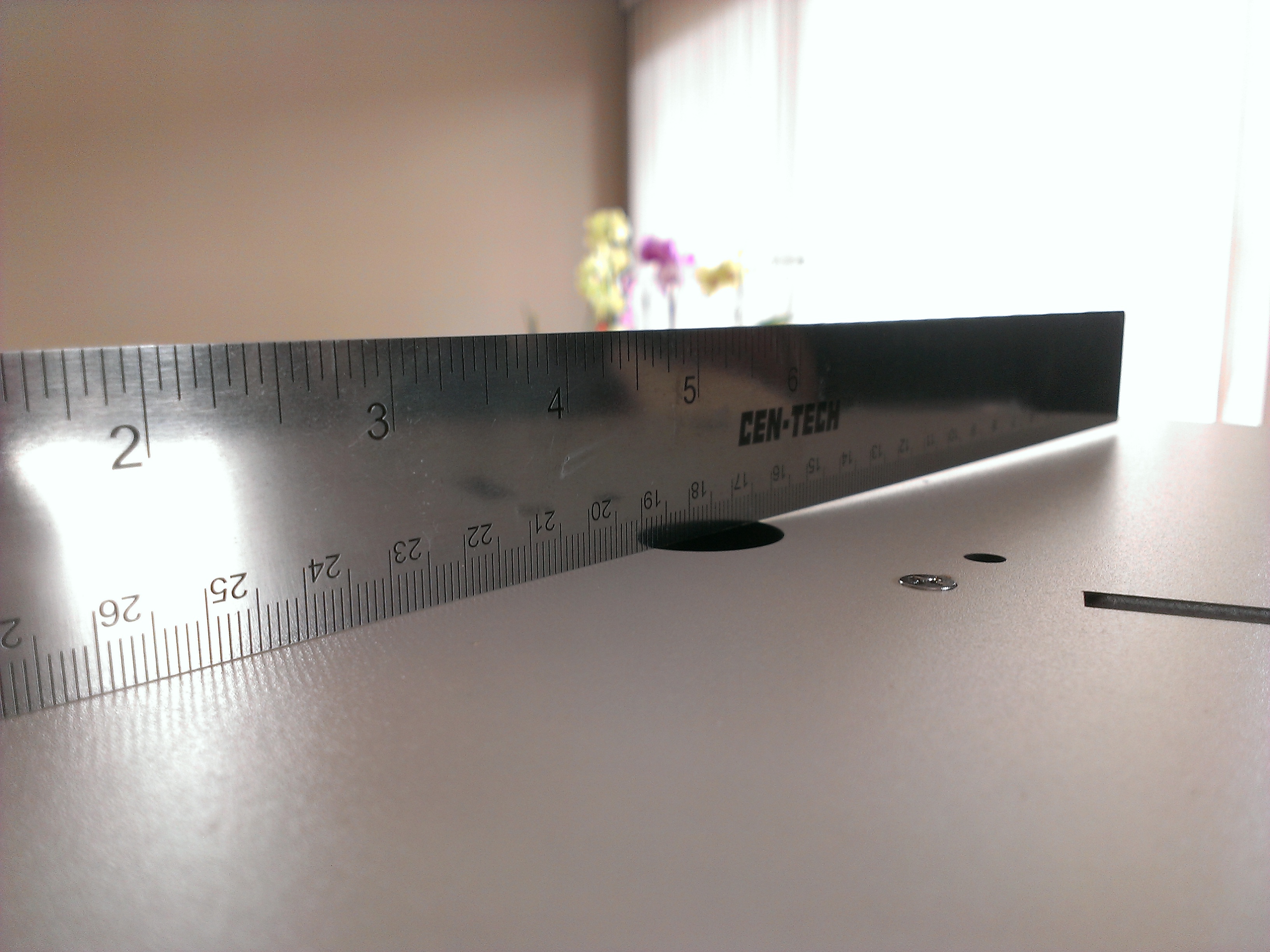 Finally, the whole assembly is visually warped. It may be hard to tell in the picture, but there's a visible waviness to the top if viewed at eye level. Placed on my granite countertops, with my missing feet, the bottom does not sit flat against the surface. Unsurprisingly with the measured bulge, it wobbles quite a bit.