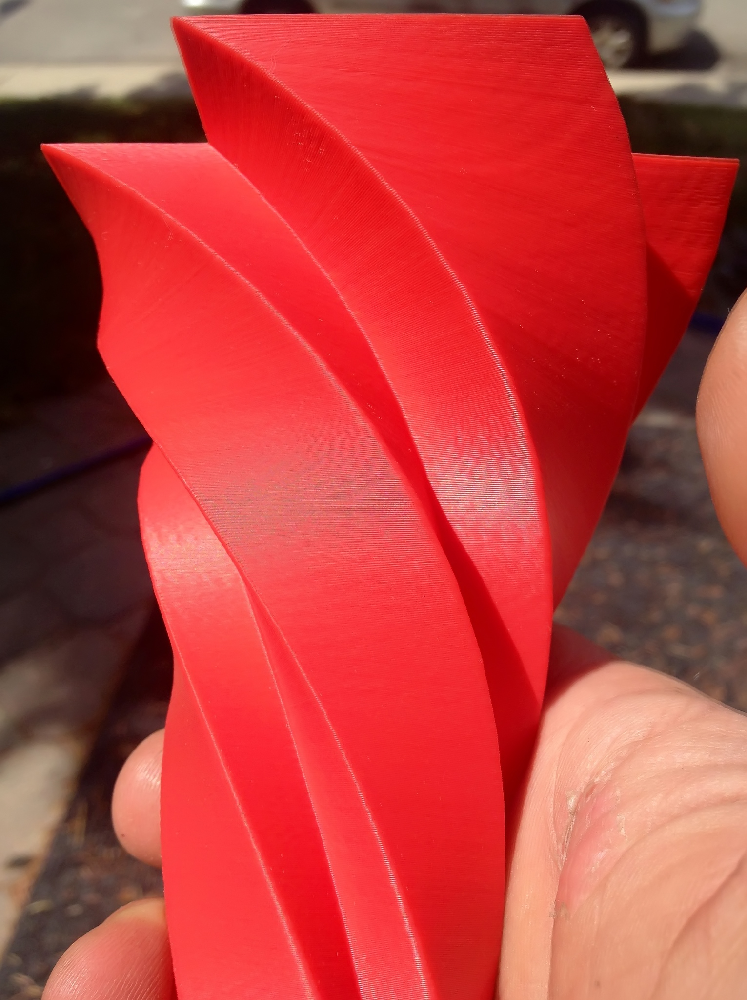 The vase is actually not one piece, it is made of two cancelled prints and they just happen to fit together nicely. (cat unplugged my cable for the red one and I messed up the clear one. Clear is PLA, red is ABS)