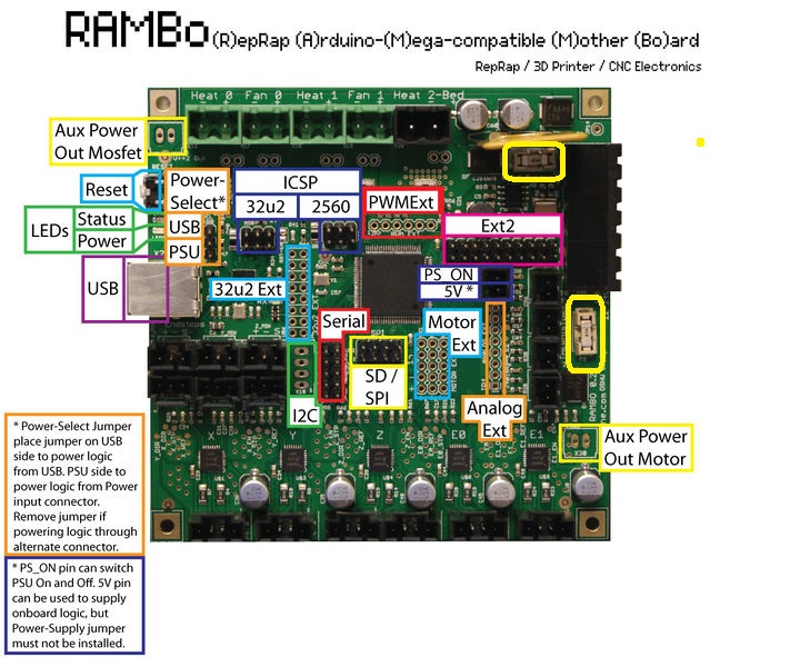 There are 3 fuses on the Rambo, did you check them all? (One big fuse, 2 little ones in small sockets)david wrote:[/size][/size] hi, my school recently bought one of the Rostock max kits. the thing is now completely built. but now when we plug in the power supply and flip the switch the Rambo board does not light up, -the PSEL jumper is hooked up so that it is on the lower 2 pins (shown in manual) -power strip(input coming from power supply) is connected to board and does supply 12v on each pin(checked with multimeter ), when i attach the usb cord to it ,and that to the computer ,nothing still happens,but when i change the PSEL jumper to the top 2 pins the board lights up and connects to the computer. of course this won't help it because that would mean it was running from the computers supplied 5v. so far for me that means that the power supply is giving 12v but the board is not taking (i checked power in pins connected directly to board with multimeter=works), the fuse is not blown, no wires are detached or reversed from needed position.