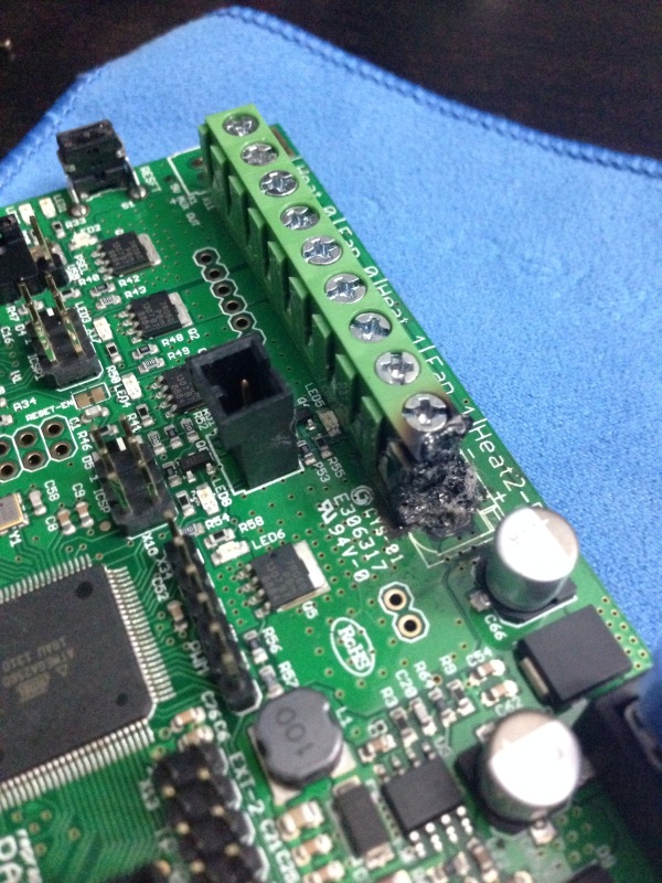 In my wanting to keep things clean, most of the other yellow 12v wires were cut, so I suppose the one rail trying to drive the heated bed was just too much for the poor thing.