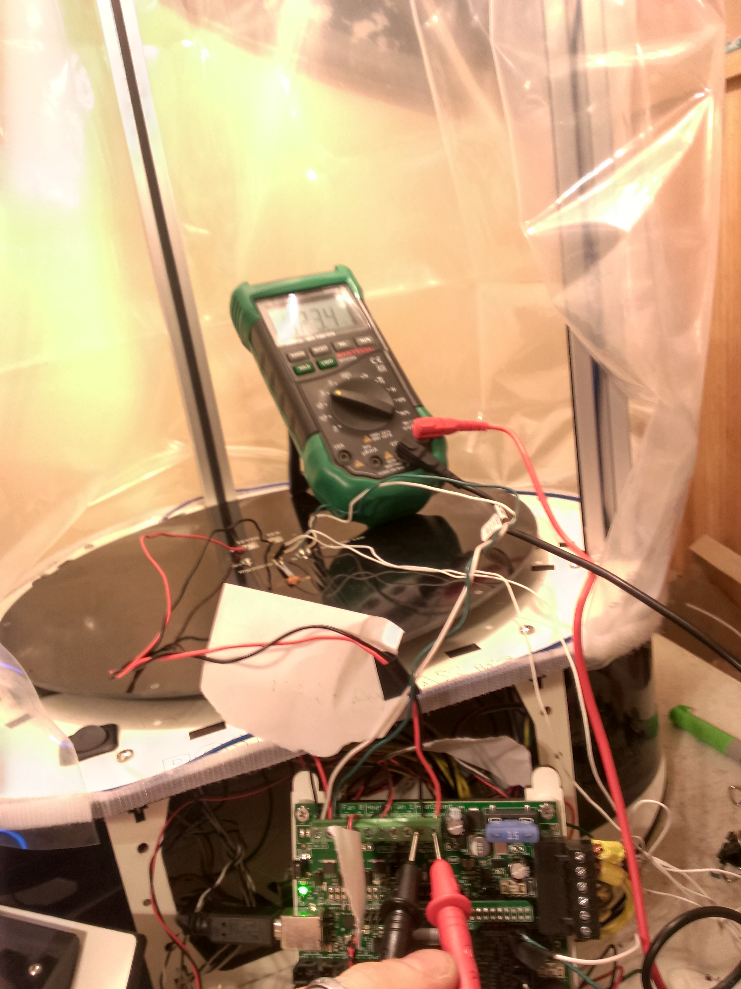 EDIT: Here are some photos to illustrate my methods. It seems like the voltage is slowly coming down. Could this be my RAMBo slowly suffering a cataclysmic failure on the Heat2-Bed output circuit? Everything else on the RAMBo seems to function perfectly except this single circuit. I've been eyeballing the RAMBo 1.3L schematics for the past hour seeing if I can pick out something that would do this.