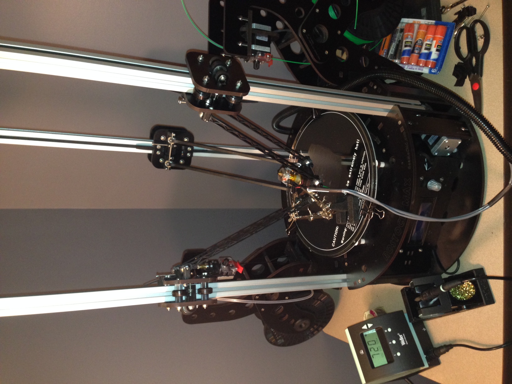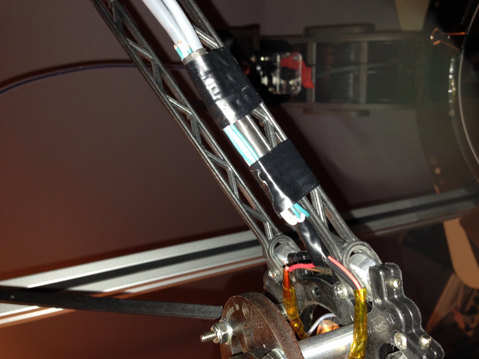 I started my evening with my normal request for the printer to "Preheat ABS". Everything went fine and the MAX came up to temp in a few minutes. The trouble started when I was ready to begin my print and noticed that my hotend was cooling off even though it was being commanded to 240C. After I tried the trick that all Microsoft users know (I restarted the MAX….. LOL) I realized I had an issue when the problem persisted. So I grabbed my multimeter and thankfully found that I had no continuity (A.K.A …. open circuit) from the hotend to the Rambo on the positive side of the harness. I started at the hotend and worked my way back from there. No obvious break was found until I tugged on the hotend harness and the wire came loose. The wire actually broke inside the insulation and the short was enough to cause my issue. I was supprized this happened since I went through a decent amount of effort to insure the cables were secure and did not bind, apparently I did not try hard enough. In any event I fixed it (see pics) but will be changing the heating element and thermistor out later this week to the 40W cartage and screw in thermistor.