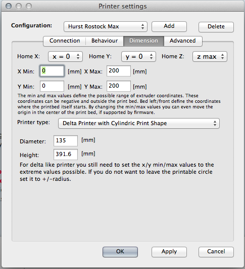 I must have a dimension setting wrong somewhere but I haven't found it yet... Any suggestions? I am running Repetier-Host on Mac so it doesn't look anything like the pictures in the manual. I have had to do some poking around to find stuff and make some assumptions. I hope to move on to PLA soon and i even have some 618 Nylon that I am wanting to try.