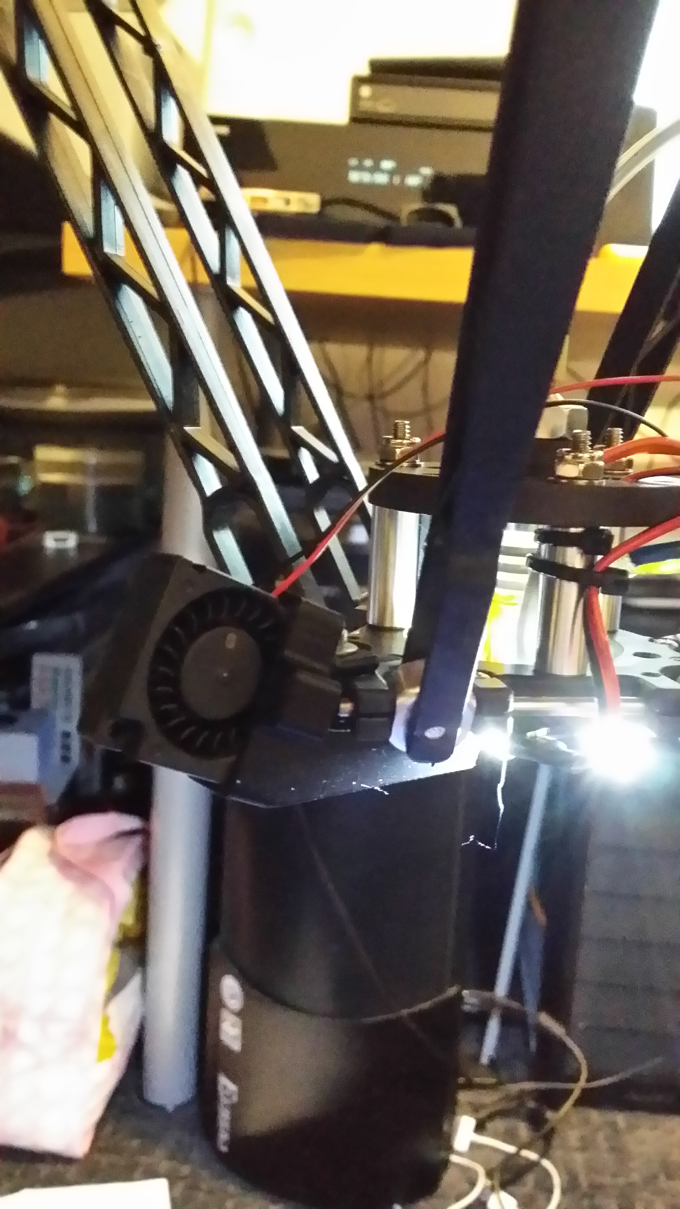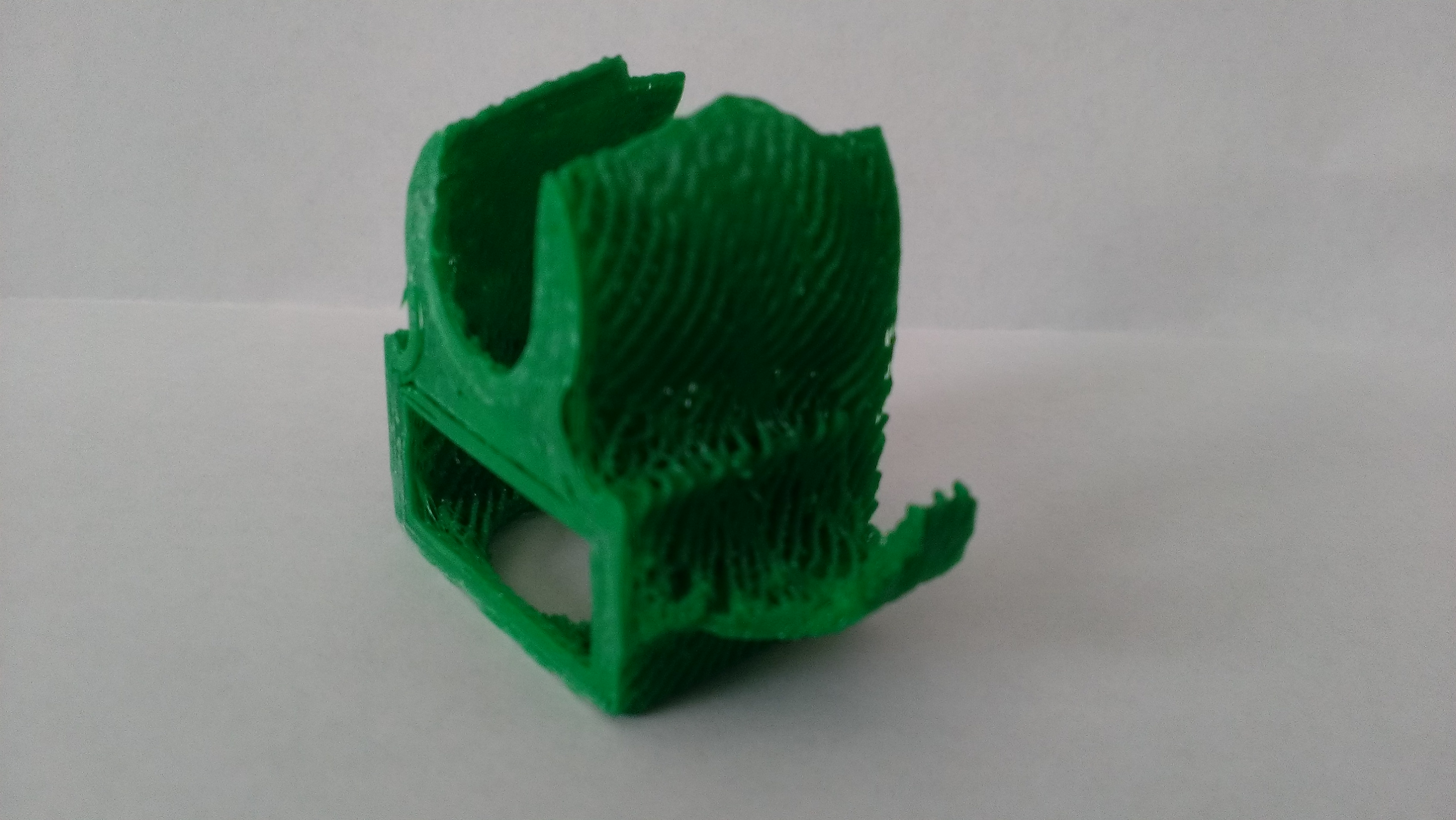 So for my first test print, the fan shroud. I know the Z was too low to start off, but you can't tell that. But I think it was just printing took fast. It was default PLA.ini file from git, for the Slicer, on a Rostock V2.